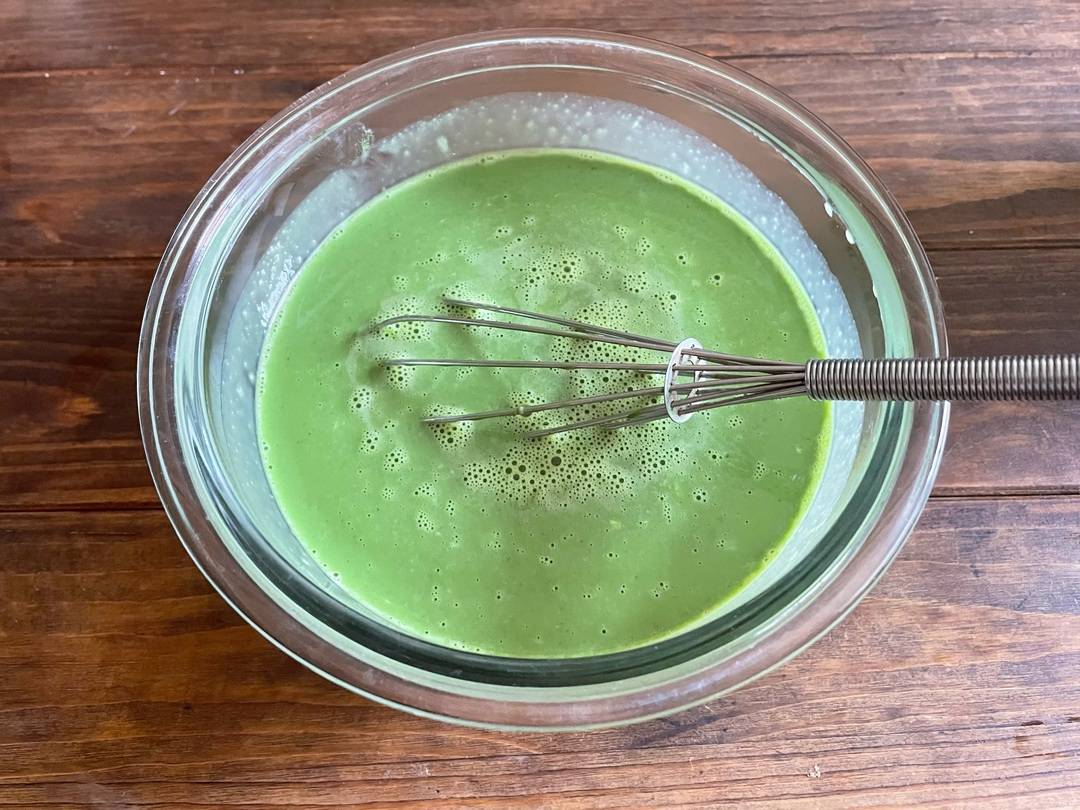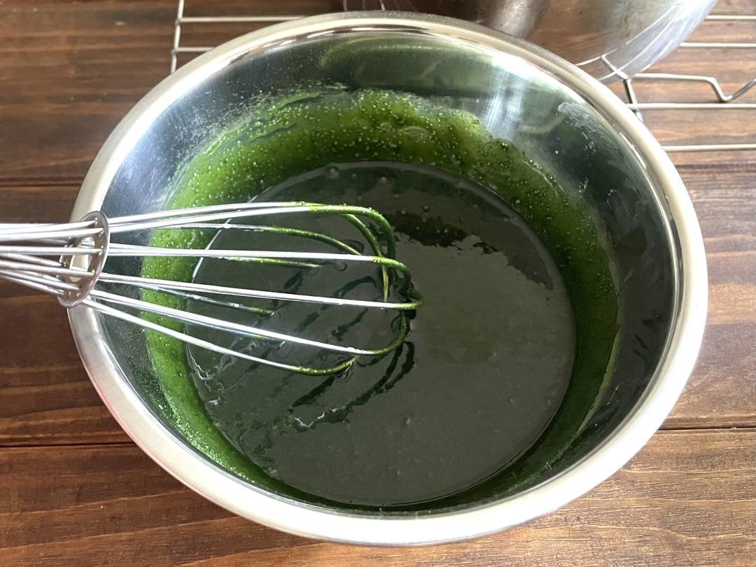 しっかり混ざれば、残りの液体は一度に加えてもOKです。泡立てないように静かに混ぜましょう。この時点で抹茶液が卵白の凝固が始まる温度である60℃よりも少し低いくらいに下がっていればベストです。 温度計が無い場合は、指を少しだけつけてギリギリ我慢できるくらいの熱さを目安としてください。もし熱すぎる場合は、ここで少し温度が下がるまで待ちましょう。