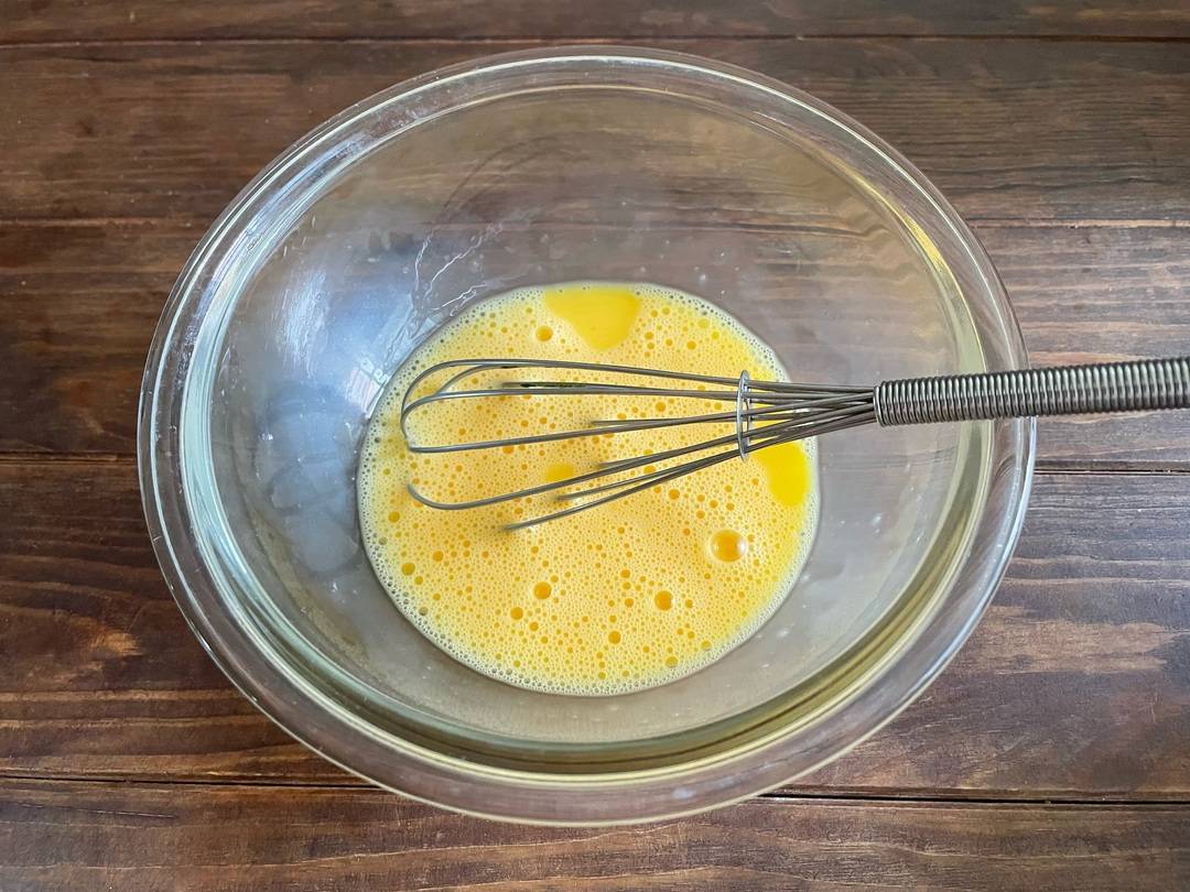 常温に戻した卵にグラニュー糖10gを加えホイッパーで混ぜます。左右に切るように混ぜれば卵に空気が入りにくく、プリンの「ス」を防止できます。