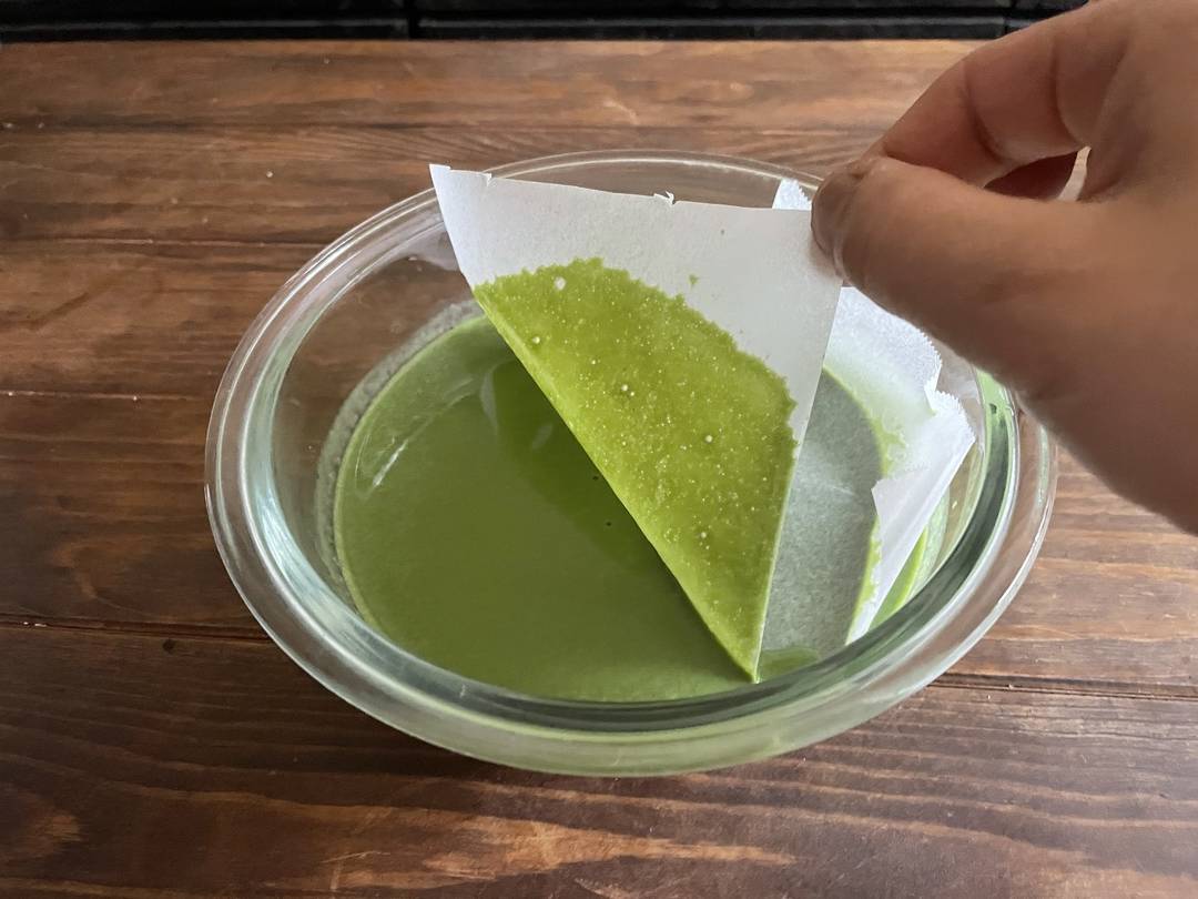 卵液に抹茶液を2~3回に分けて加えます。ここでも空気が入らないように静かに混ぜましょう。全体が混ざったら濾してください。
