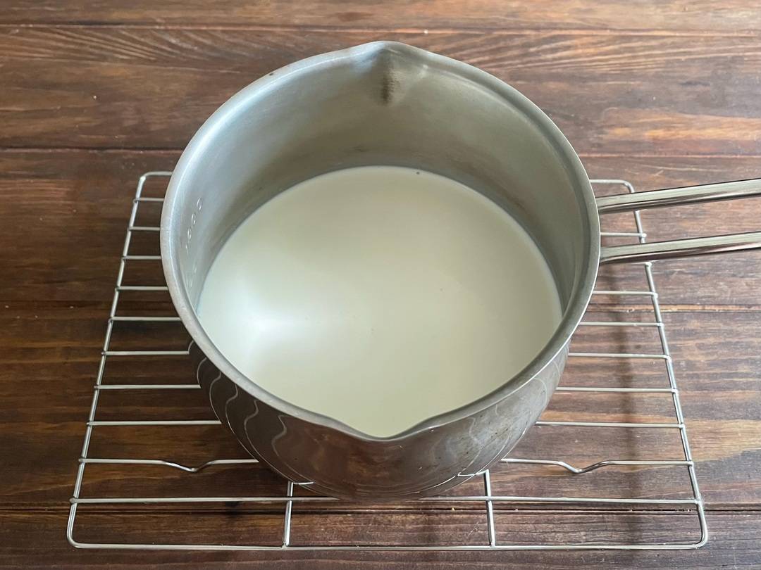 牛乳と生クリームを70℃程度まで温めます。温度計が無い場合は、鍋のまわりが少し沸々してきたら火を止めましょう。温めすぎると卵液と合わせるまでに適切な温度に下がらず、焼成前にプリン生地内の卵に火が入って固まり始めてしまうので注意です。