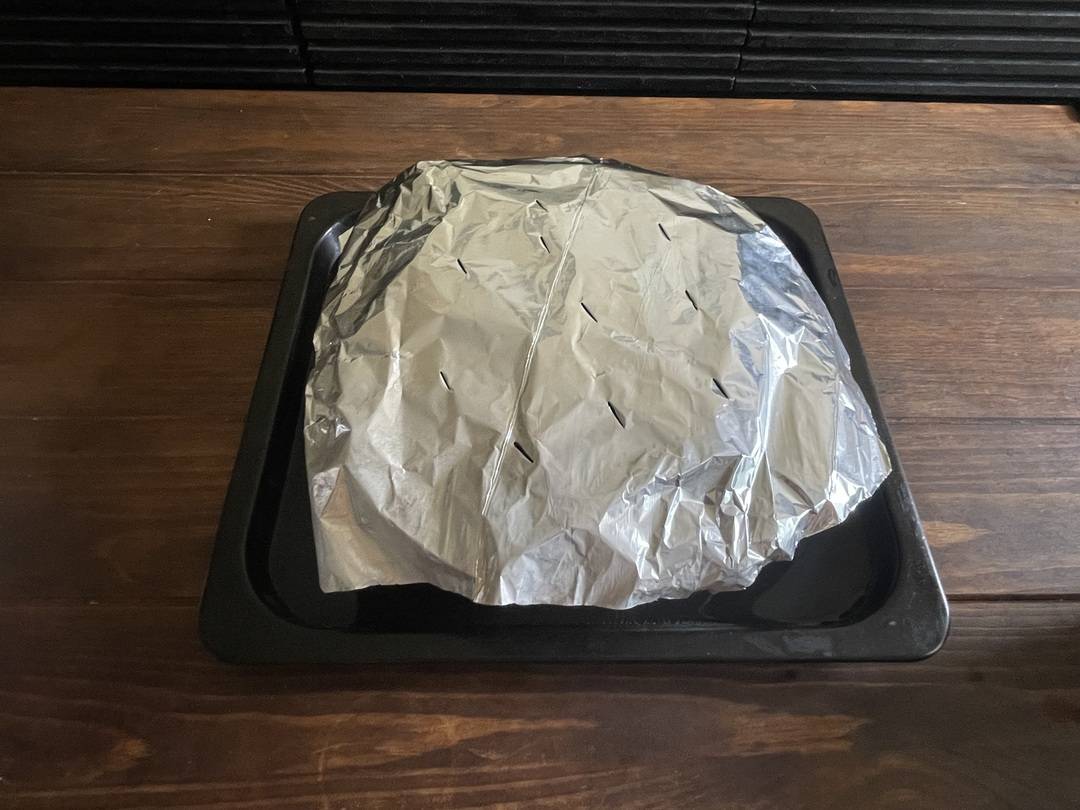 数か所穴をあけたアルミホイルをかぶせて150℃のオーブンで20~25分程度焼きます。オーブンを開けると庫内の蒸気が逃げてしまうので、早い段階から頻繁に確認するのはやめましょう。オーブンの大きさにもよりますが、20分は扉を開けずに我慢です。