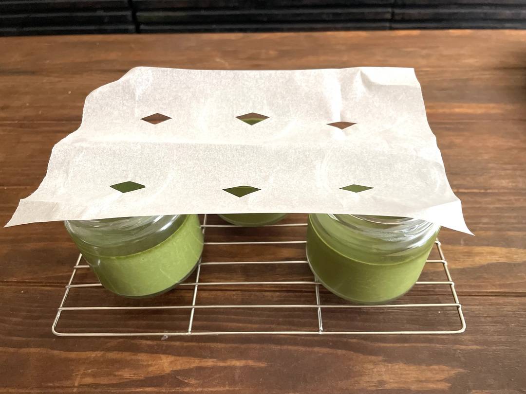 瓶を左右にそっと揺らし、中心が液体っぽさのないプルンとした揺れ方になれば焼き上がりです。すぐに湯せんから取り出し、常温で粗熱を取りましょう。この際、穴をあけたクッキングシートをかぶせて蒸気を逃がしつつ、乾燥を防止します。