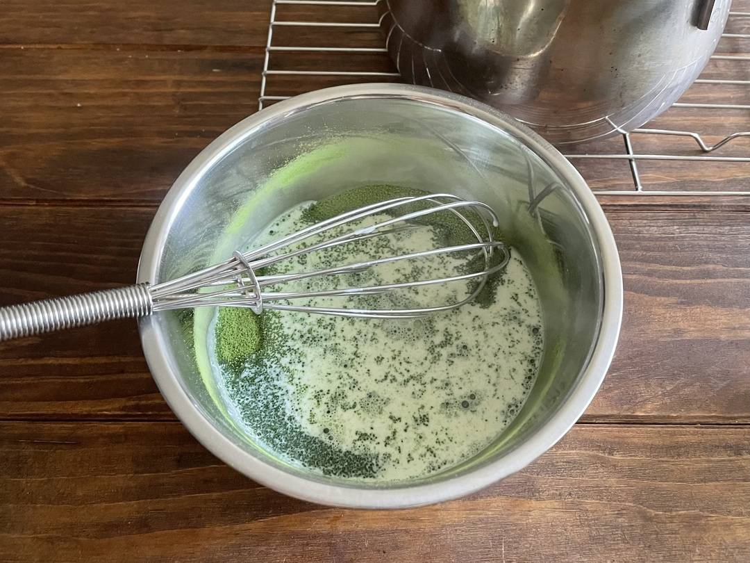 温めた液体をグラニュー糖と抹茶を合わせたものに加えます。まず液体の3分の1ほど加え、素早くホイッパーですり混ぜます。グラニュー糖のジャリっと感がなくなるまでしっかり混ぜましょう。ボウルの側面に付いた抹茶があればゴムベラで落としてください。