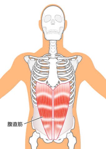 腹直筋とは、肋骨から恥骨まで走行しているお腹の正面にある長い筋肉です。主に体幹部を前に曲げるとき(背中を丸めるとき)に力を発揮します。また、重い物を押すときなど、カラダを安定させるよう力を発揮している筋肉です。