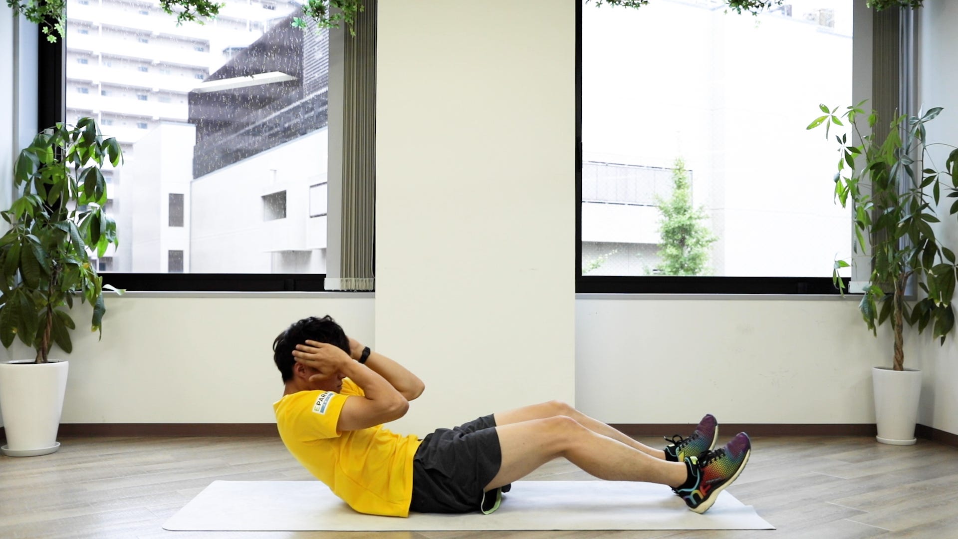 仰向けになり、膝を曲げる。 手は頭の後ろ、もしくはお腹の上に置く。 息を吐きながらおへそを見るように上体を起こす。
