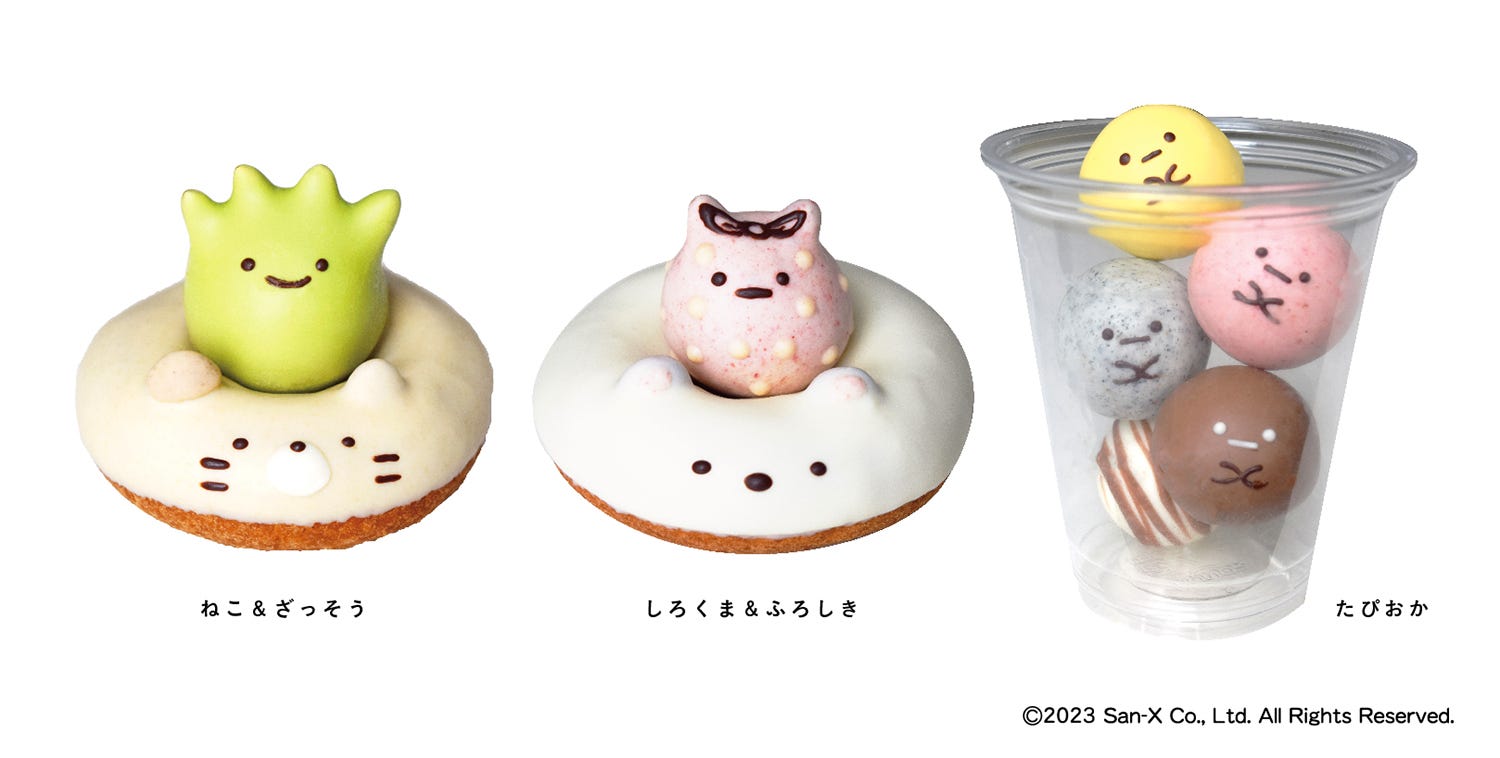 7月は、昨年も好評だった「ねこ&ざっそう」「しろくま&ふろしき」に加えて、新しく「たぴおか」が一口サイズのコロコロドーナツに。8月にも新たなすみっコのドーナツが登場予定だから、追加情報をお楽しみに!
