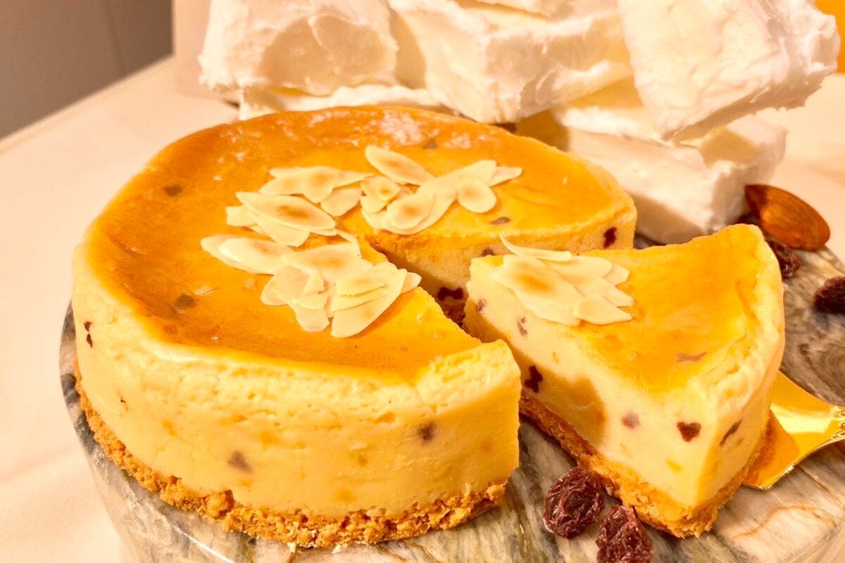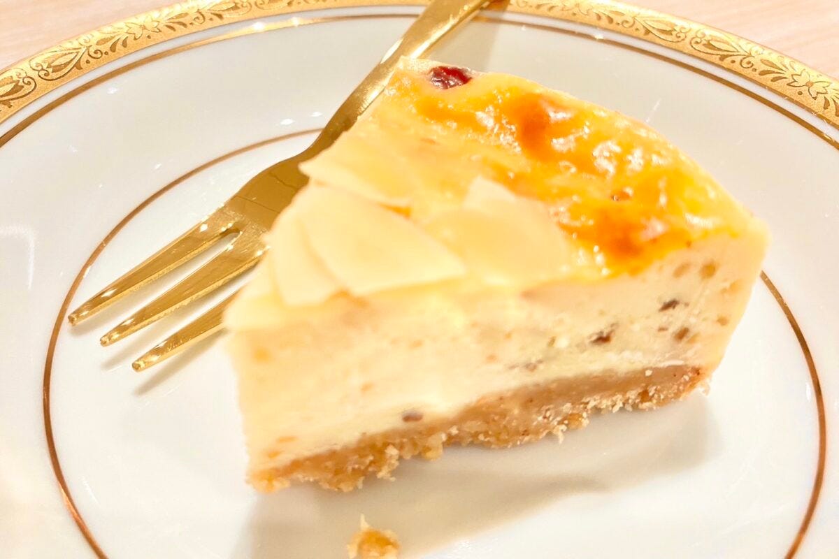 クリームチーズとスライスアーモンドで仕立てたベイクドチーズケーキ。隠し味には、ラムレーズンとシナモンを使用しています。