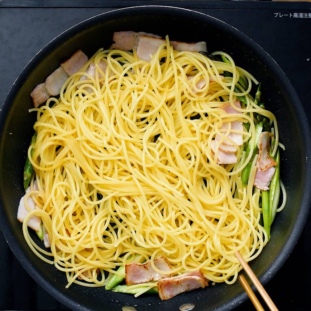 フライパンにオリーブオイルを熱し、アスパラガスを炒め、火が通ったらベーコン、スパゲティ、塩を加えて混ぜながら炒めます。