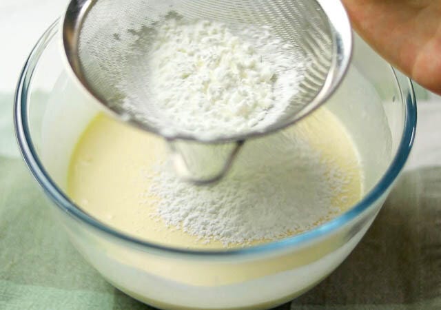 ⑦ レモン汁を加えて混ぜ、コーンスターチをふるい入れます。
