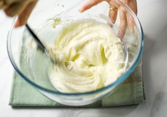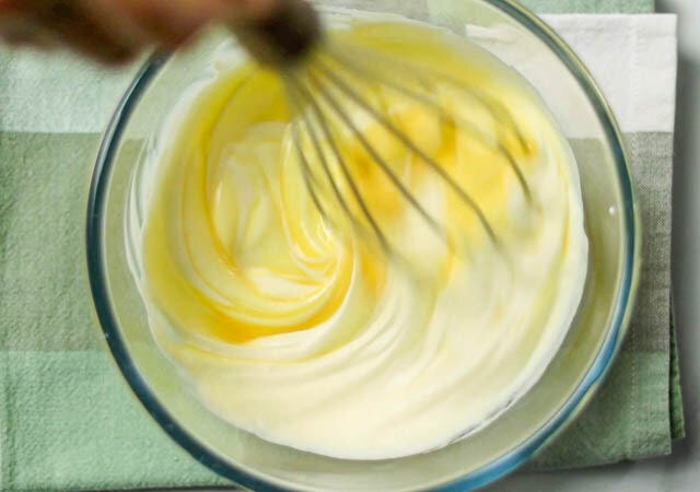 ⑤ 別のボウルにサワークリームを入れて混ぜ、なめらかになったらギリシャヨーグルトを加え混ぜ合わせます。