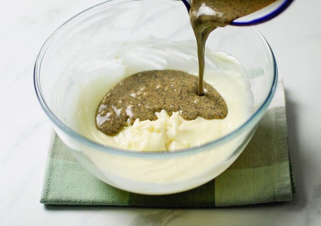 ④ ②のホワイトチョコレート生地を③のクリームチーズ生地に加え、ホイッパーでよく混ぜ合わせます。