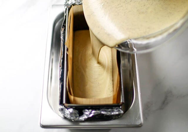 ⑨ 生地を濾し、準備した型に注ぎ入れます。