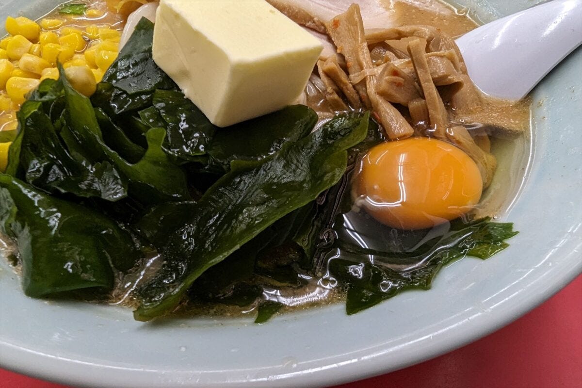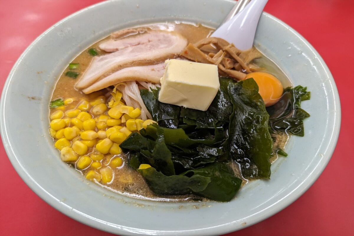 本命の味噌ラーメン系の中で、くるまやラーメンマニアの記者一押しが「デラックス味噌ラーメン」。通常の味噌ラーメンにコーンとわかめ、生卵にバター、チャーシュー、メンマがトッピングされたボリューム満点の一杯である。