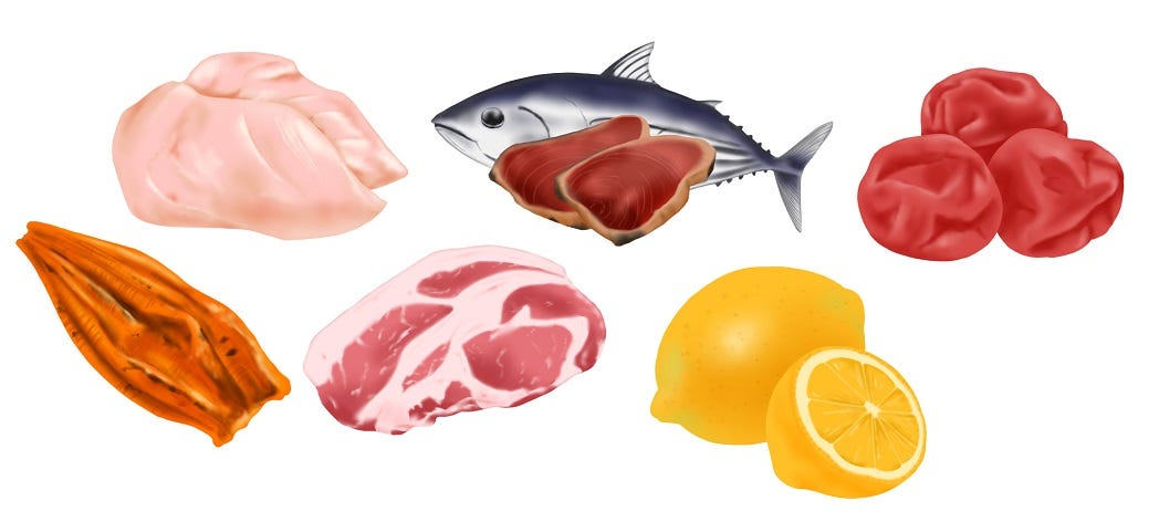 食材例レモン・グレープフルーツなどの柑橘類、梅干し、酢 など