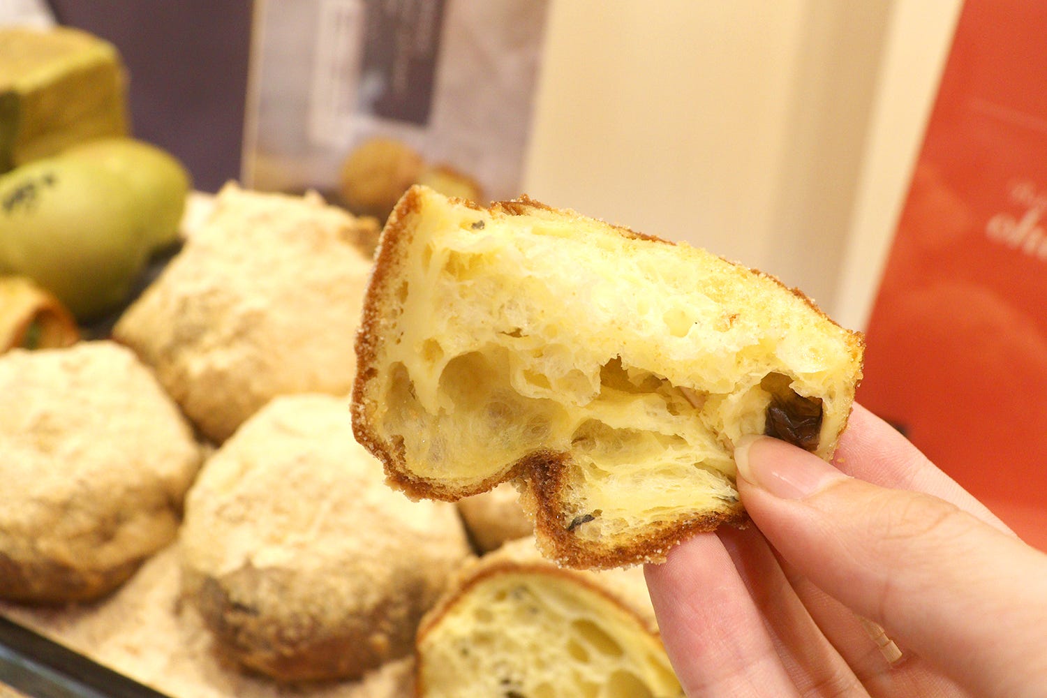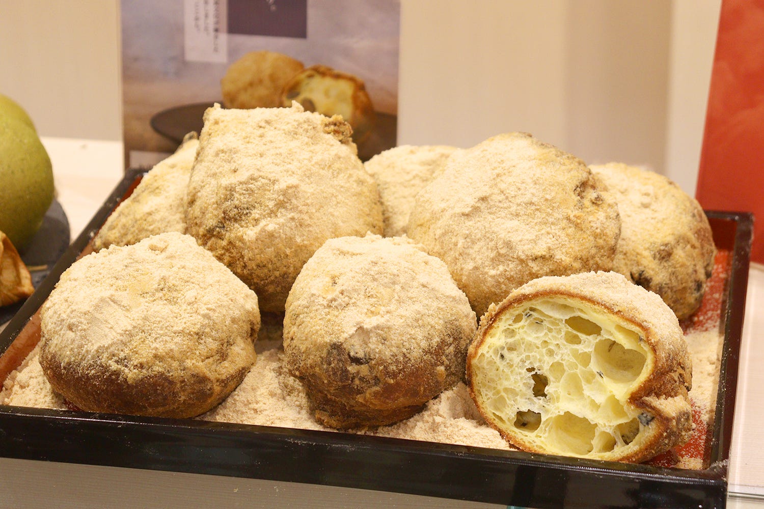 中には丹波⿊⾖が入っており、サクッほろっとした食感がアクセントとなって楽しい。生地はシュークリームのシューと同じ製法で作られており、最後に焼くのではなくあえて揚げることで独特のしっとり感を演出しているのがミソだ。