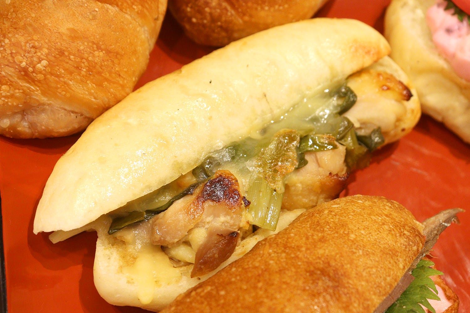 「鶏の⻄京焼と九条ねぎナムルのパニーニ」は、具材たっぷり京都嵐⼭⾵パニーニ。⽩みその⾵味絶妙な嵐⼭熊彦直伝胡⿇ネーズがGOODアクセント!「⾚かぶとポテサラのフォカッチャサンド」は、⽢酸っぱい独特の味わいが特徴の⾚かぶ漬けの美味しさを楽しめるフォカッチャサンド。