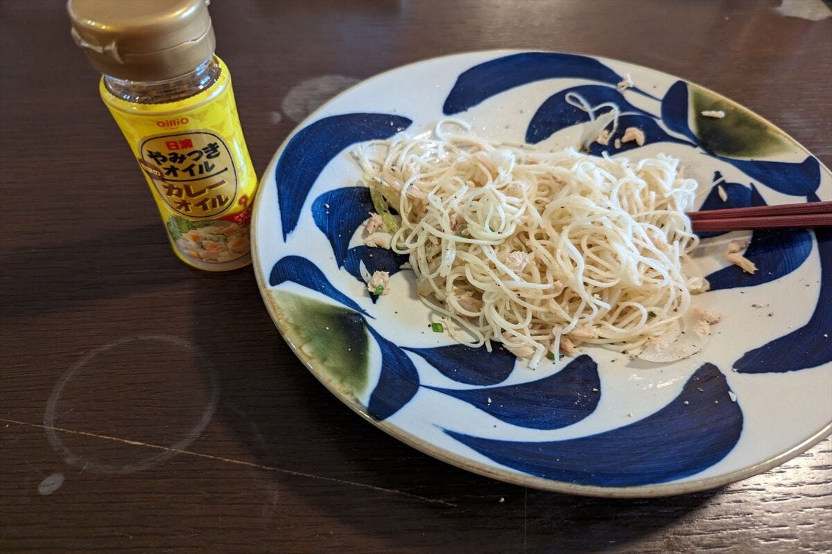 ソーメンチャンプルーにカレーオイルをかけると、ツナやニラなどカレー風味が加わるとより美味しくなる食材の味が引き立ち、さらに食欲が増す味に。