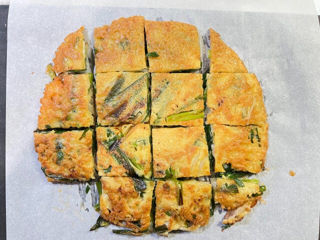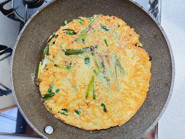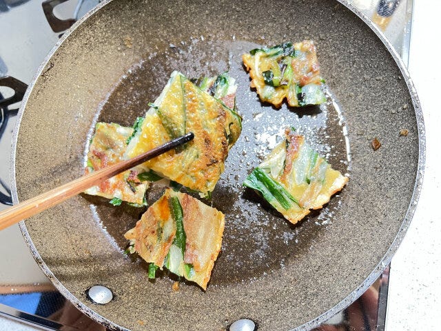 韓国の家庭や屋台では、チヂミを焼いておいて、食べる直前にもう一度焼くので、カリッカリに仕上がるそうです。もう一つ、コウケンテツさんによると、『焼いた人は、端っこの一番カリッカリの一番美味しい所を食べて良い』そうです。これは、焼いた人の特権なので、ぜひ!