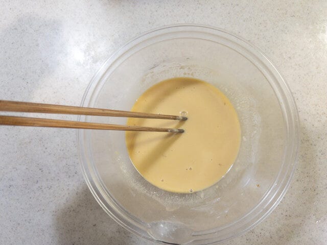 ① 卵・小麦粉・片栗粉・しょうゆをボウルに入れ、様子を見ながら水を加え、ガーっと混ぜます。