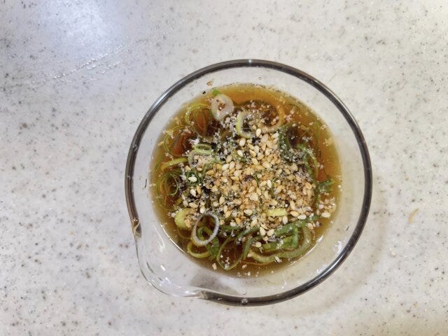 ⑥ たれを作ります。ボウルにしょうゆ、酢、わけぎの小口切り、白いりごまを加え、お好みで韓国の粉唐辛子を加えて混ぜ合わせます。あれこれ色々加えるより、シンプルな酢醤油ベースのたれがチヂミに合うそうです。