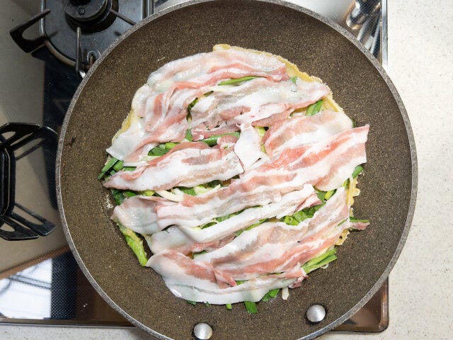 生地に豚肉を加えるのではなく、豚玉のように生地の上に豚肉の薄切り肉を広げて焼くのので、カリッカリに焼かれた豚肉が食欲をそそります。