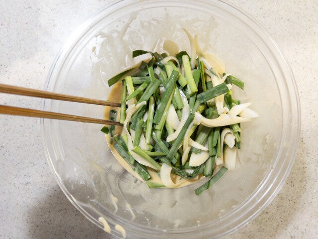 ② 玉ねぎは薄切り、にらは4〜5cm幅にカットして①に加え、ざっくりと混ぜ合わせます。