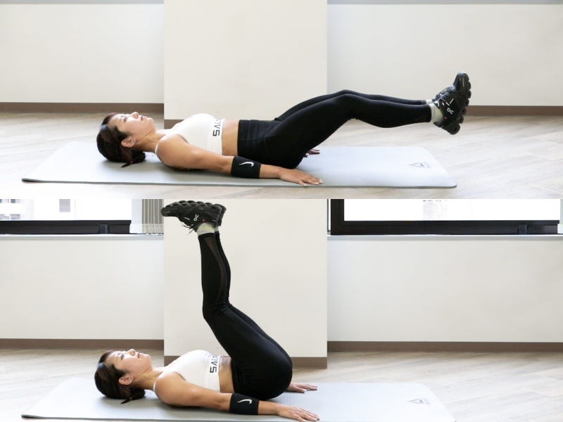 正しいやり方 仰向けで寝る 腰を床につけるように意識しながら、両脚を床から少し浮かせる 垂直まで浮かせたら、ゆっくりと元の姿勢に戻る。脚は床から少し浮かせたままにしておく この動作を繰り返す