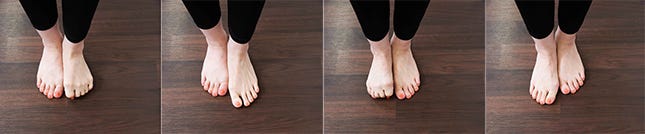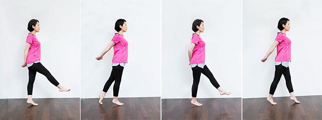 手を後ろで組んで背筋を伸ばし、つま先立ちをします。右脚を前に出して組んだ手を後ろに大きく振り上げ、つま先から着地しながら組んだ手でお尻をポンとたたき、同時に今度は左脚を前に出します。右脚と左脚を交互にテンポよく5回繰り返します。