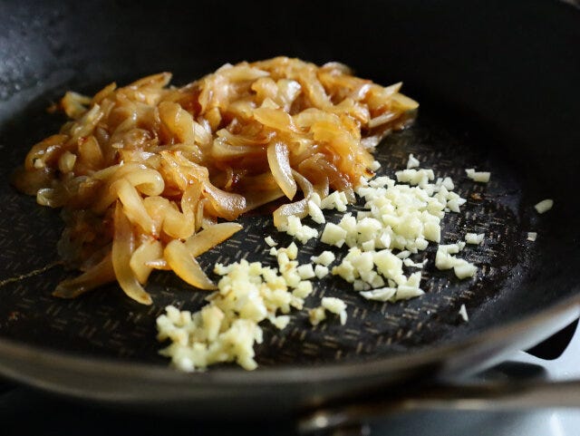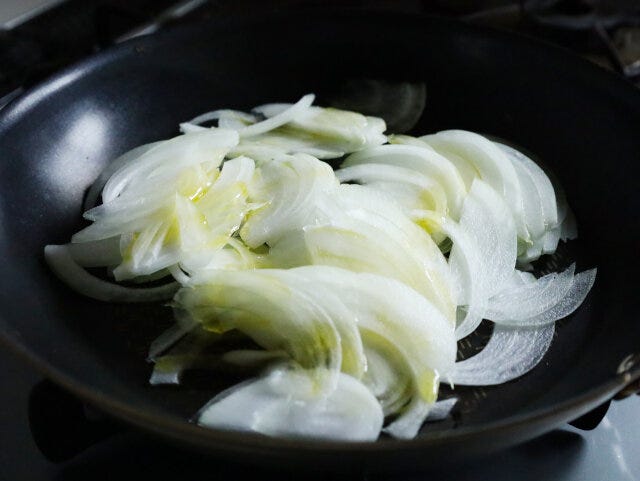 ① フライパンに、薄切りにした玉ねぎとオリーブオイルを入れたら火を点け、中火で7~8分またはあめ色になるまで炒める。