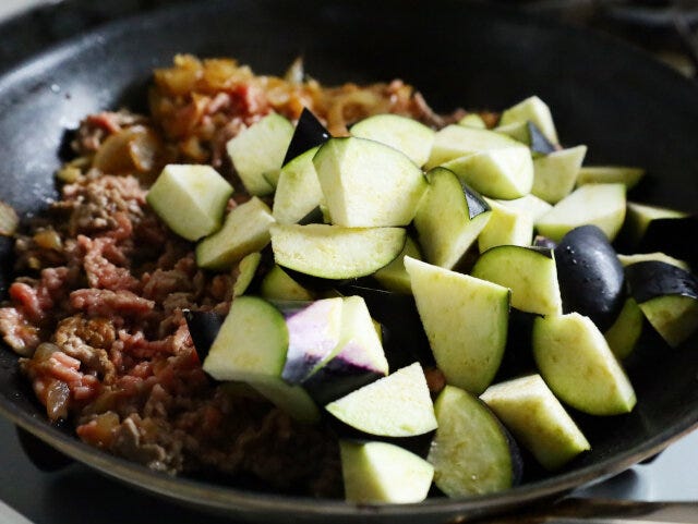 ④ 小さめのひと口大の乱切りにしたなすと塩少々を入れ、なすに油が回るように炒める。