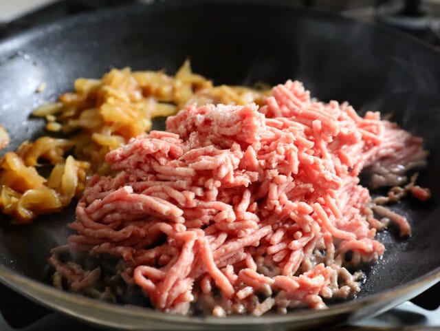③ 合いびき肉と塩を少々入れ、半分くらい色が変わるまで炒める。