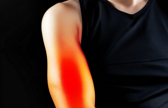 それは、筋肉痛の痛みに似た「筋腱付着部炎」です。これは、「筋肉や腱」と「骨」の付着部に起こる炎症で、痛みが長引くことが多いのが特徴です。