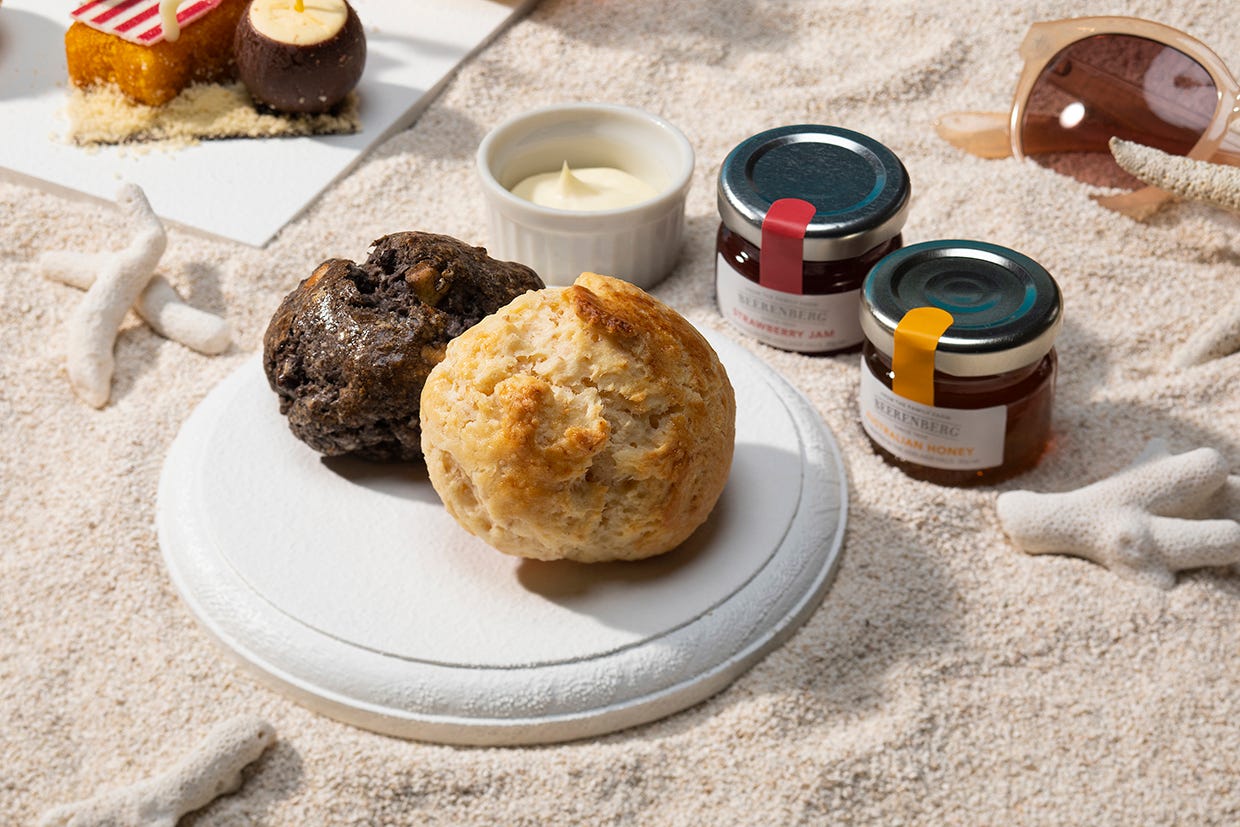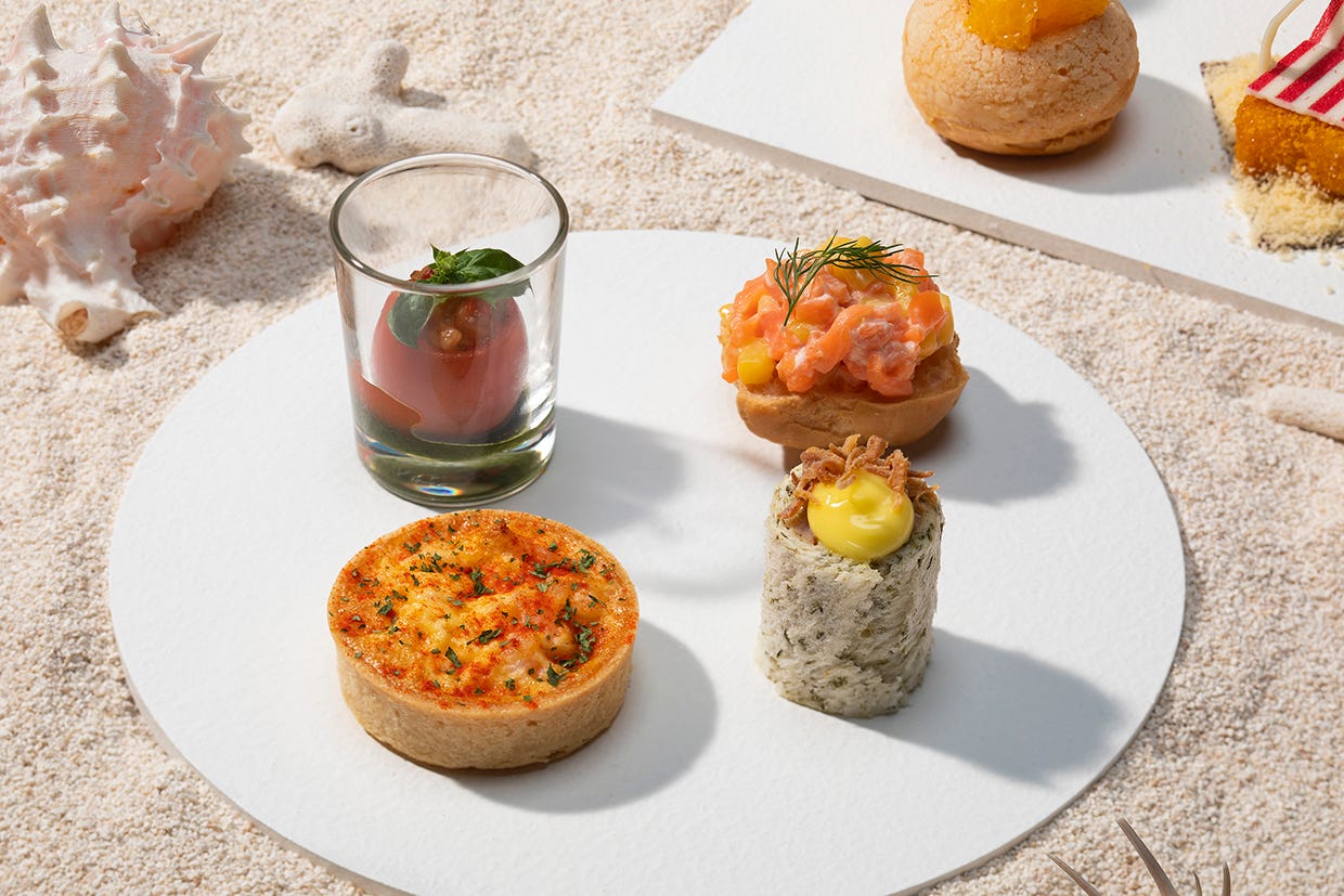 セイヴォリーメニューは、スパイシーなカレー風味の「ソーセージとカレーキャベツの海藻パンのサンドイッチ」や、魚介の旨みを利かせた「シーフードのキッシュ」、彩り豊かな夏野菜たっぷりの「トマト、ラタトゥイユ、バジル」など、夏のワクワク感をさらに盛り上げてくれる4種が並びます!