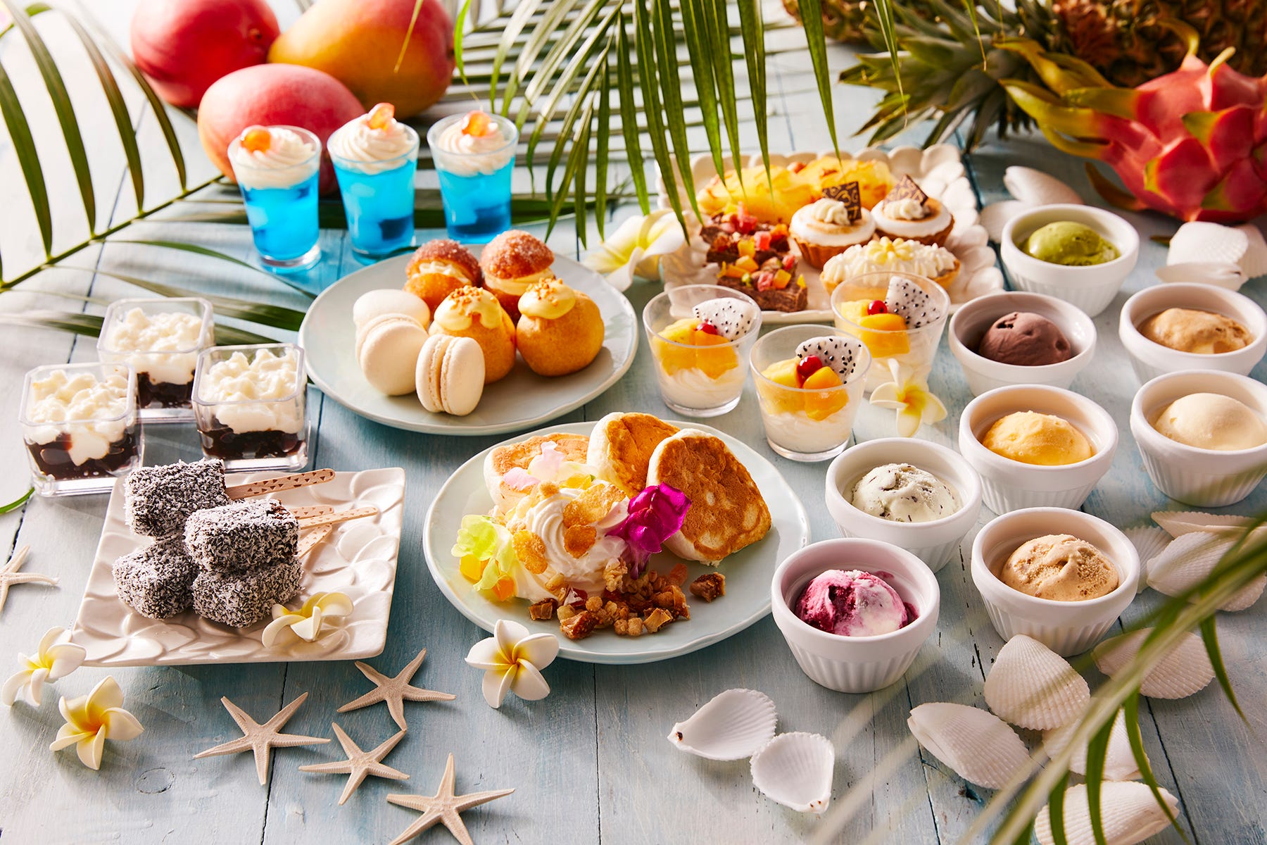 ドラゴンフルーツやマンゴーを使った「トロピカルパフェ」、口の中でふわりと溶けるような「スフレパンケーキ」も。お好みのアイスクリームをトッピングして、オリジナルデザートをつくるのも楽しい♪