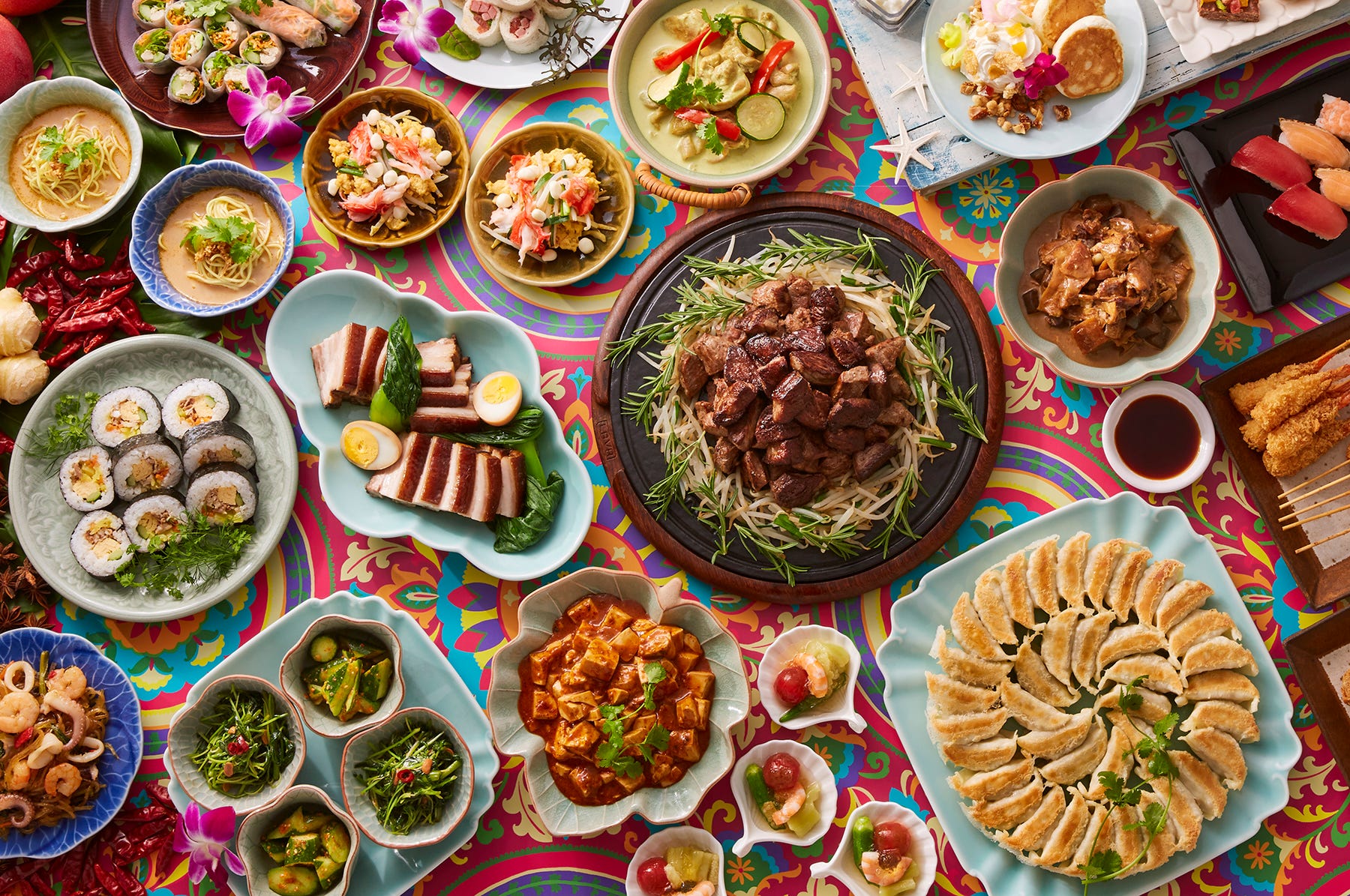 「餃子」や「麻婆豆腐」など親しみがあるアジア料理に、「牛ステーキ」「串カツ」といったこどもも喜ぶメニューもズラリ。 デザートだけで全21種の大ボリューム