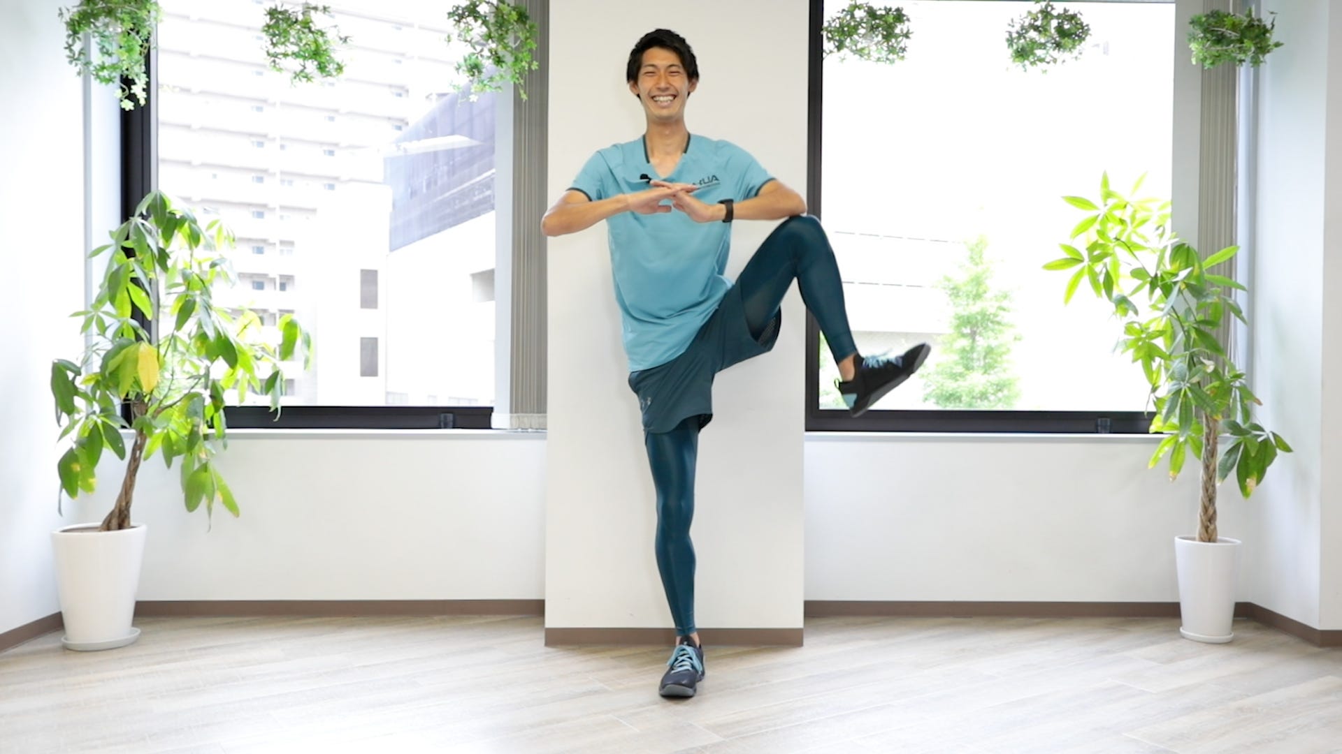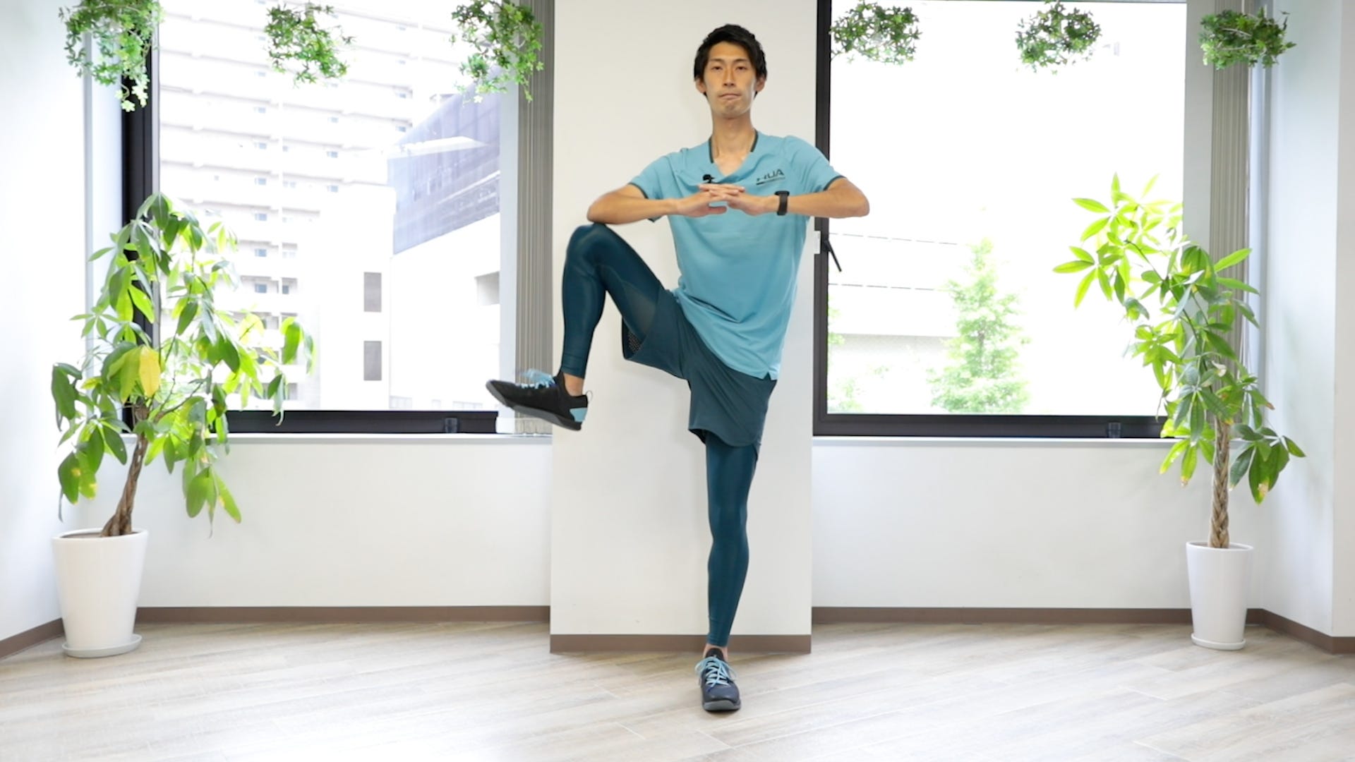 正しいやり方 立位の状態で肩幅分足を広げる 肘・膝をクロスに引き寄せる 右肘&左膝→左肘&右膝を交互にやる
