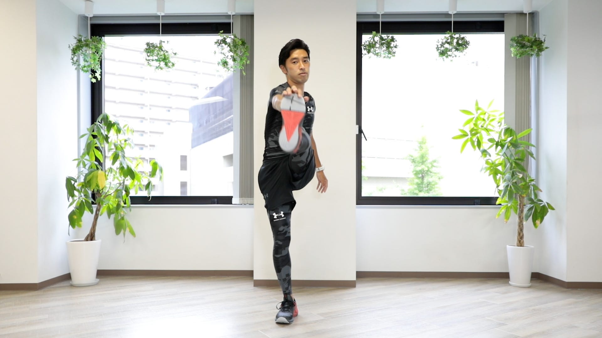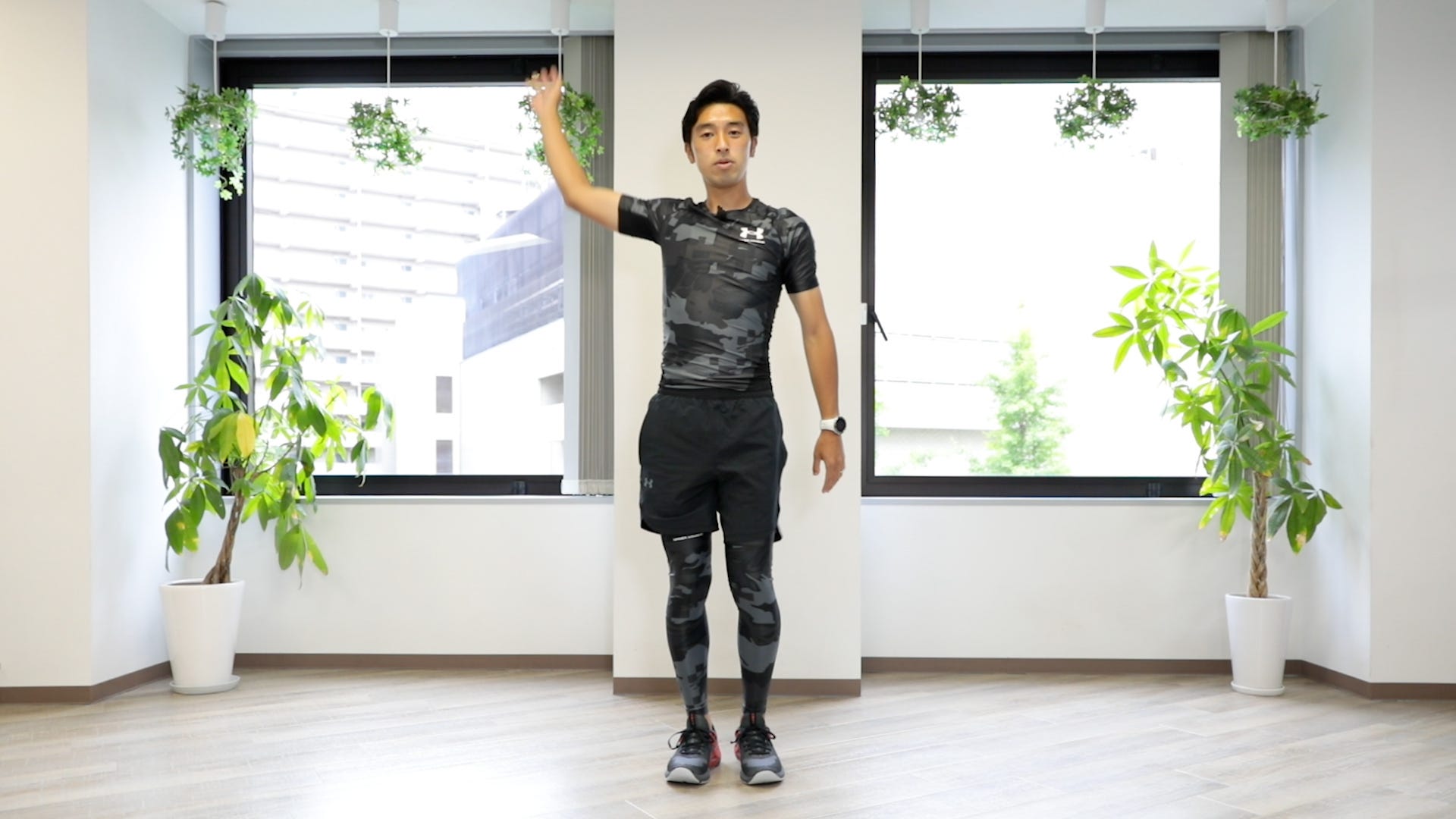 正しいやり方 姿勢を正してまっすぐ立つ 腕は後ろから大きく回して、手と反対のつま先とタッチする