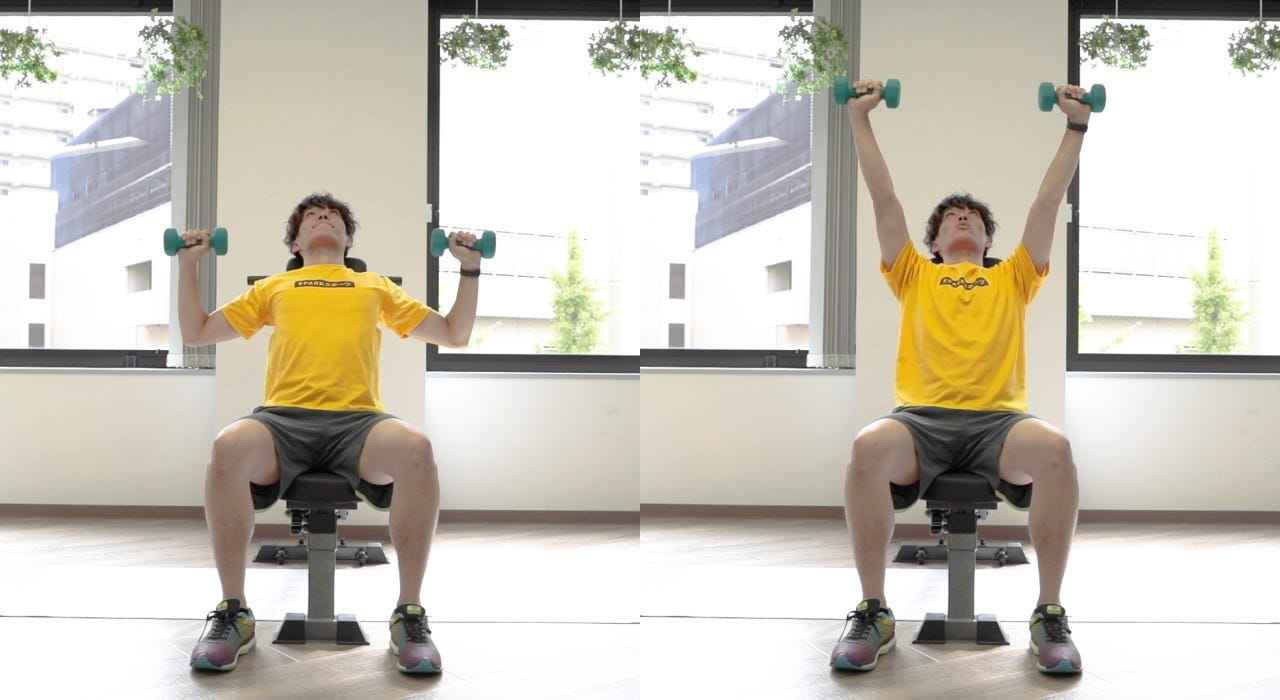 重いウエイトを頭上へ持ち上げるショルダープレスは、体勢を崩したり、つぶれたときに肘や手首などを傷める危険性が高い種目です。