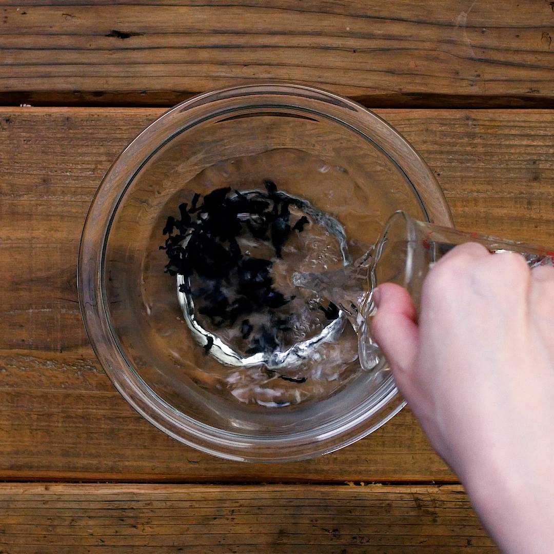 わかめは水につけてもどし、しっかりと水気を取ります。