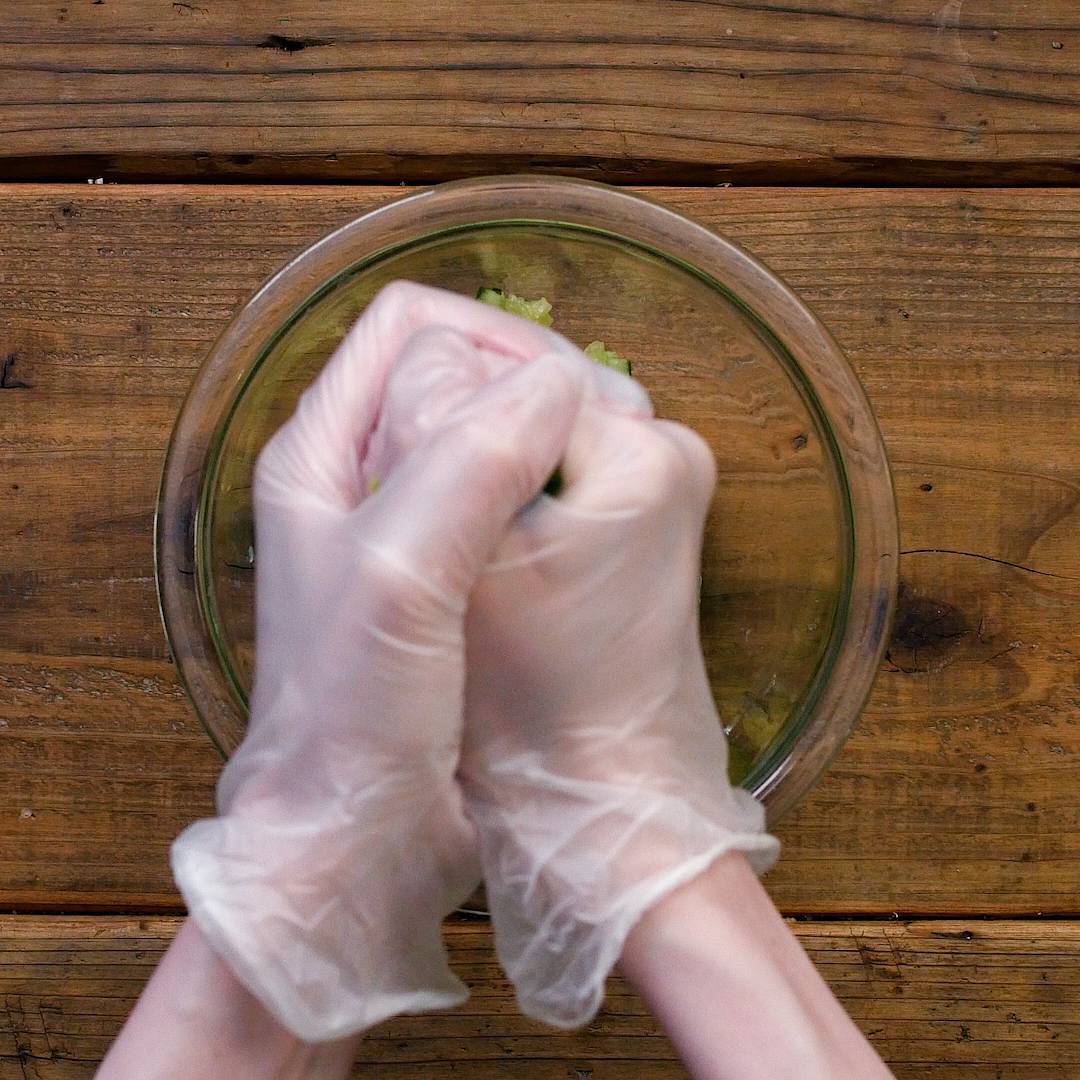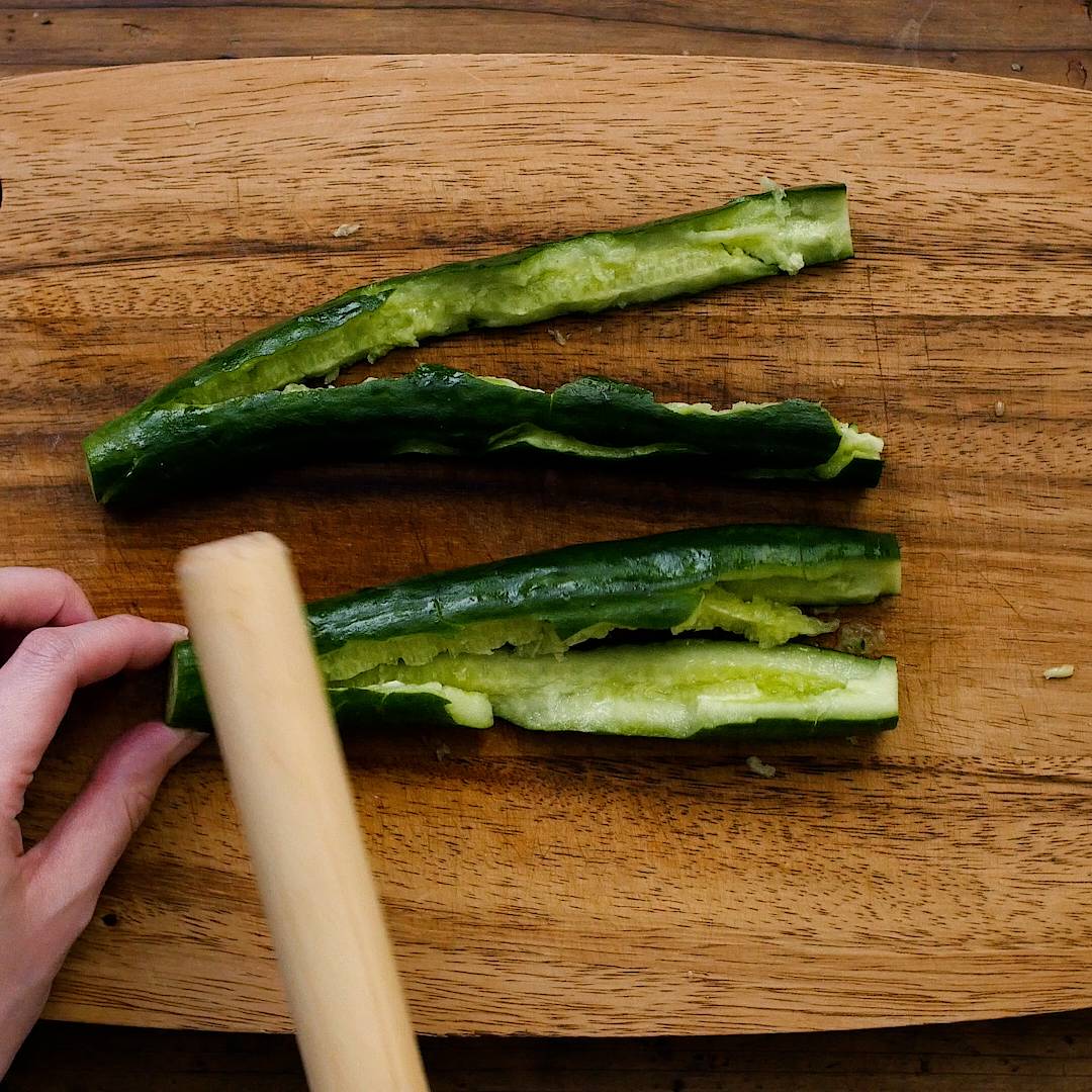 きゅうりはヘタを落として麺棒などで叩き、食べやすい大きさに手でちぎります。