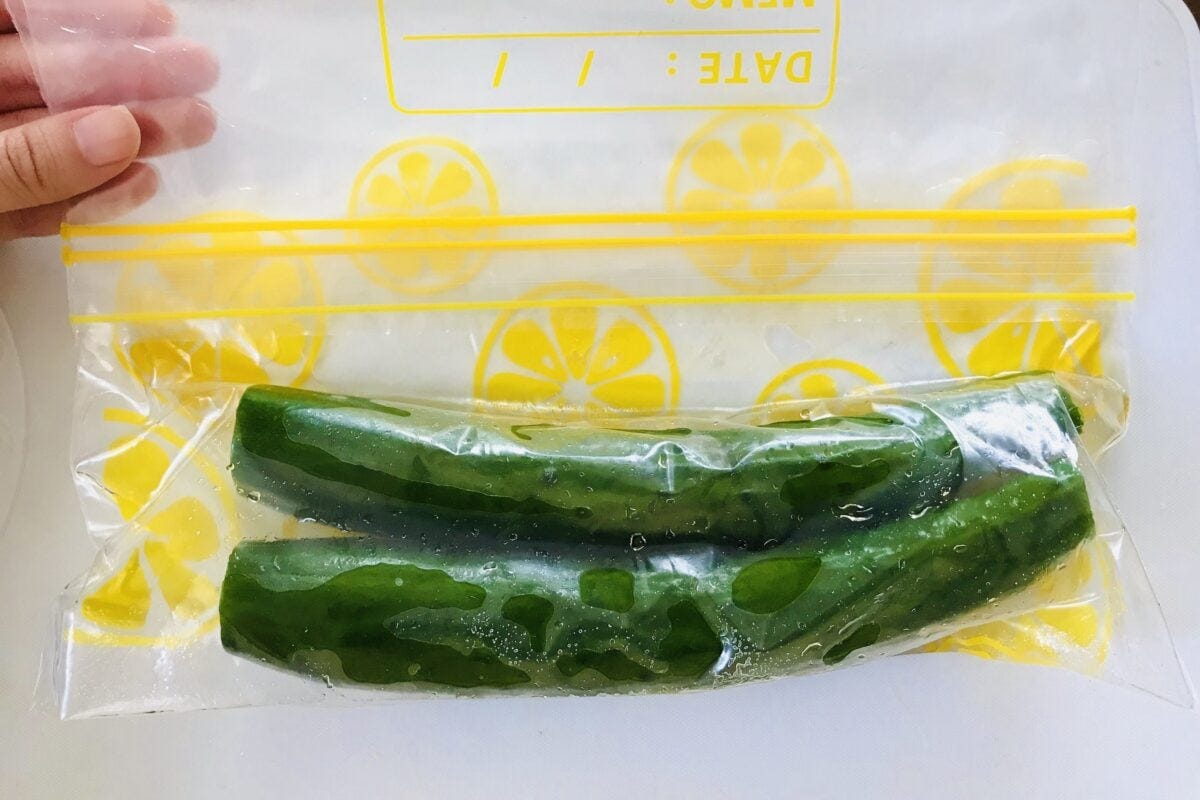 きゅうりはヘタを取ってポリ袋などに入れ、白だしと砂糖を加えます。