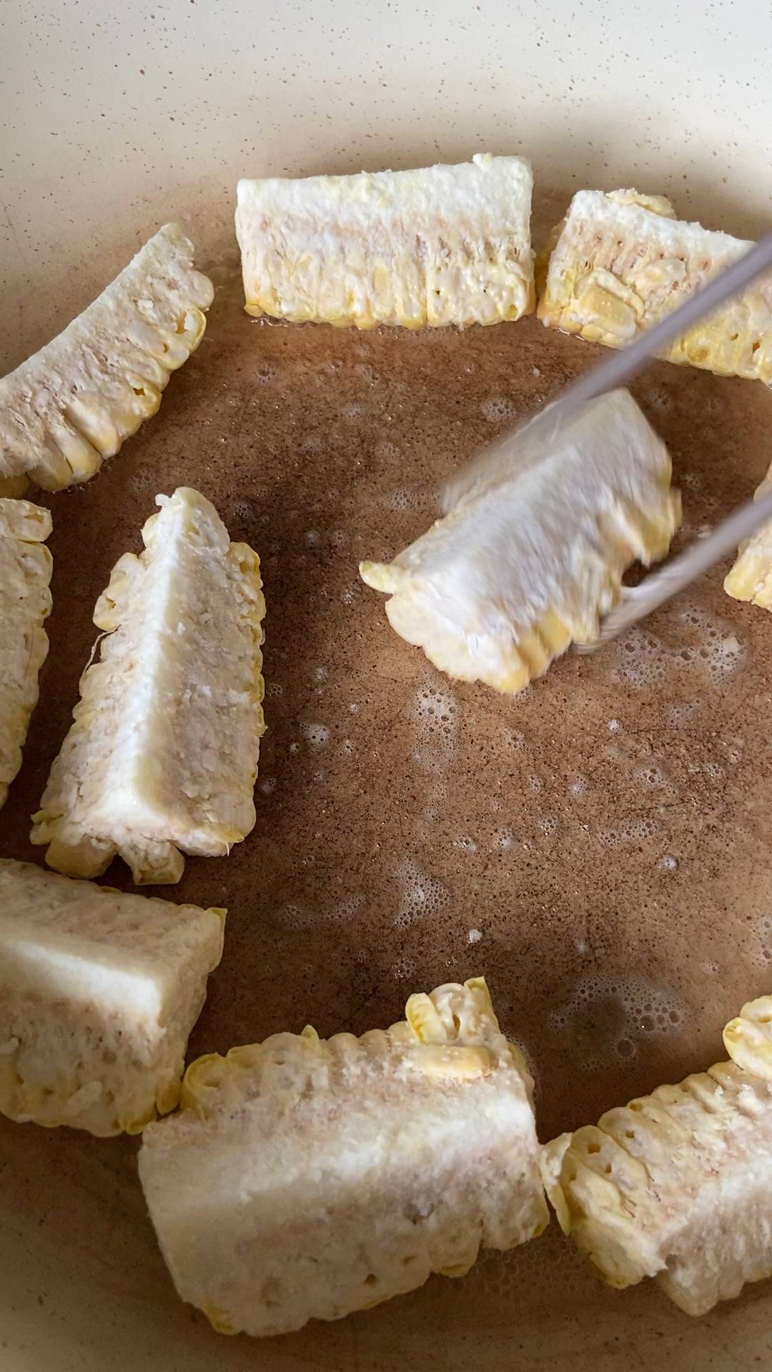 フタをして3分ほど焼いたら、転がして他の面も焼いていきます。