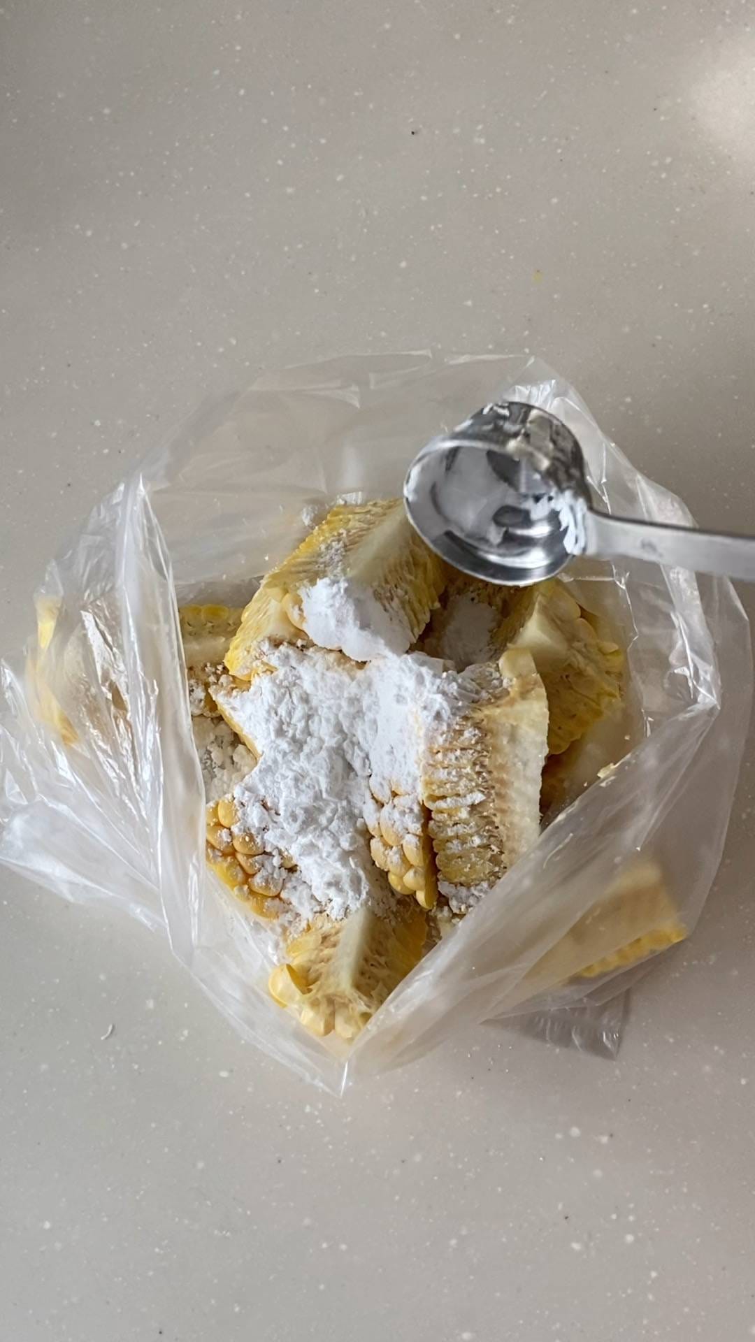 ポリ袋に切ったとうもろこしと片栗粉を入れます。
