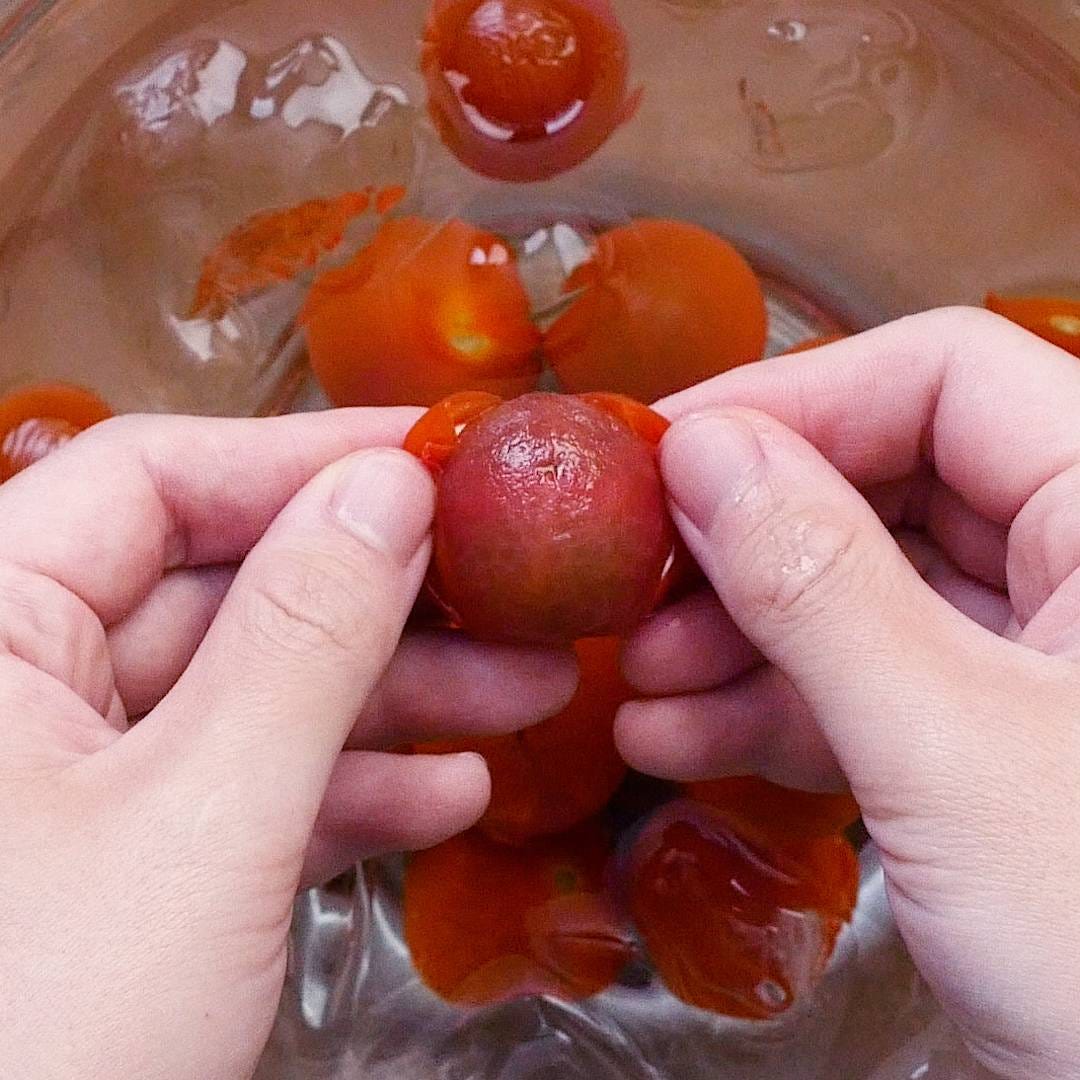 鍋に湯を沸かし、トマトをサッとくぐらせて氷水に取り、皮をむきます。