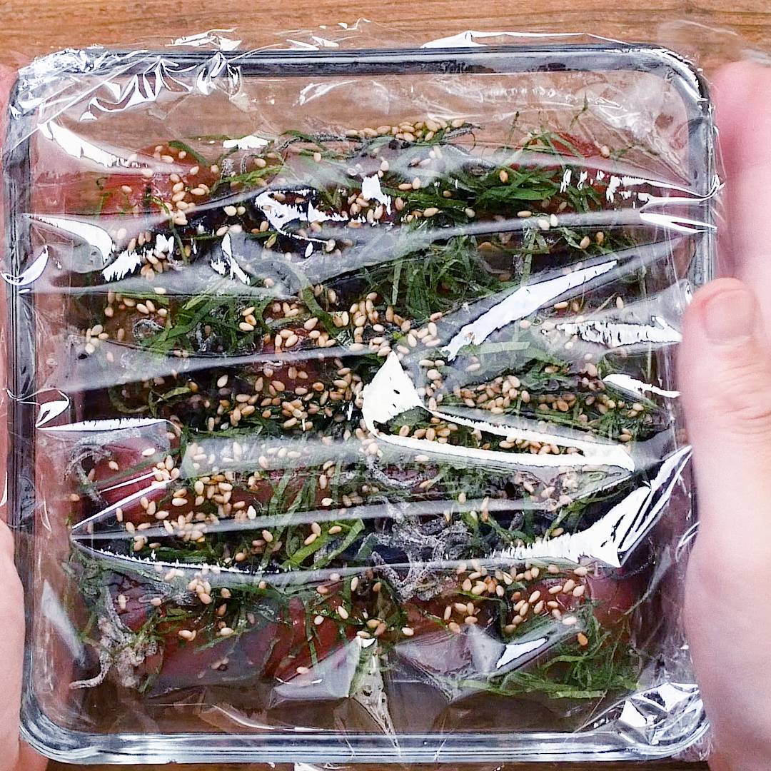 容器に②を並べ入れ、(a)の材料をかけます。ラップをかけて冷蔵庫で漬け込んで完成です。