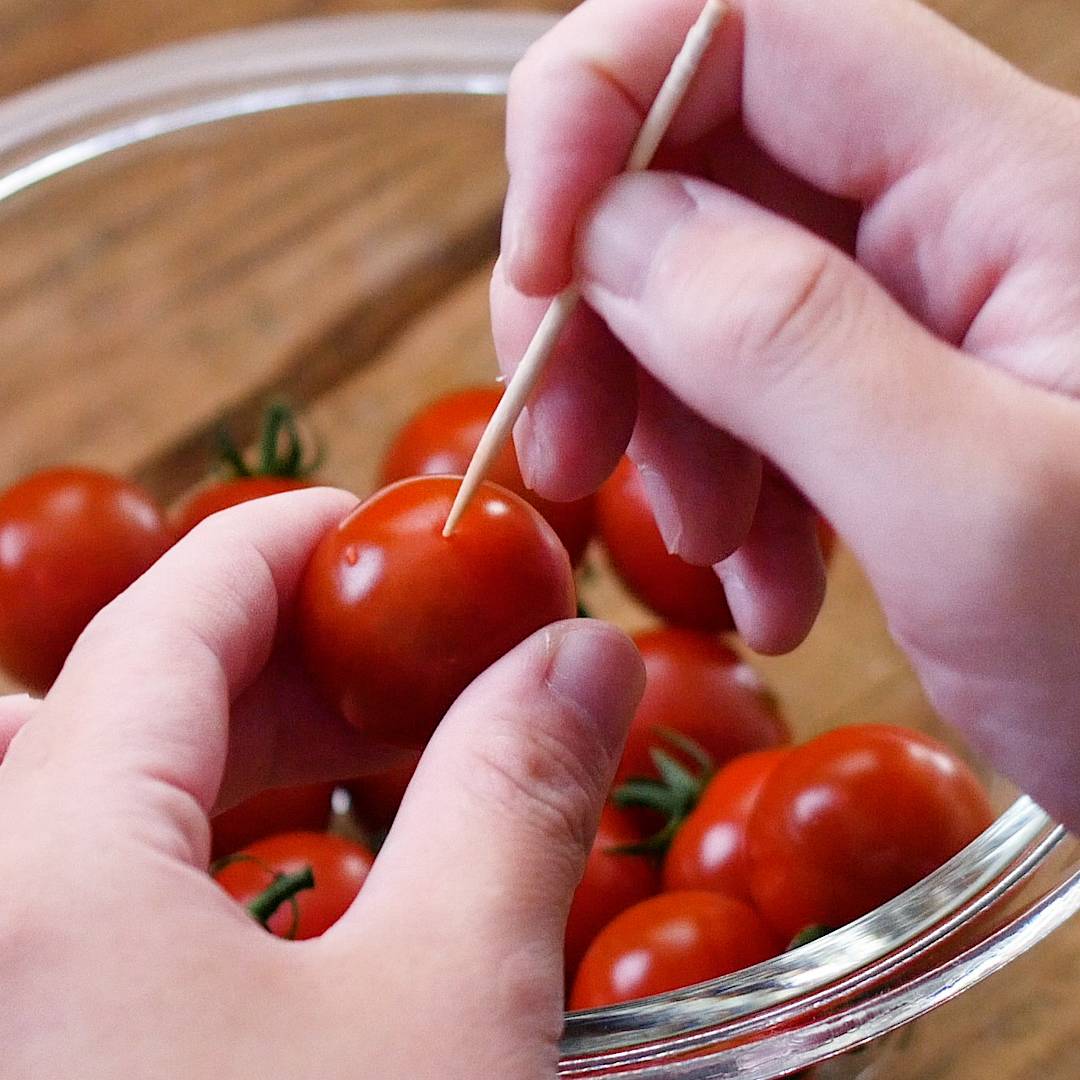 トマトはヘタを取り、反対側につまようじで穴をあけます。