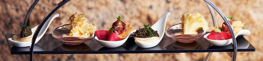 この時期に旬を迎える食材をフランス料理の技法で調理した「サーモンリエットと大根のラヴィオリ仕立て」や「イベリコ生ハム、ラバッシュ」「キャビア、サワークリーム、ブリニ」など、珠玉の4品が登場します。