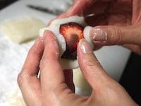 もち生地を平らにのばし、中央にいちごを包んだあんをのせ、底を閉じるように包み込んで、出来上がりです。