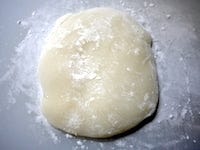 ゴムベラでひとまとめにするように混ぜ、片栗粉の上に取り出します。あら熱が取れたら、6等分にします。生地がくっつかないように、両手にも片栗粉をつけて作業します。