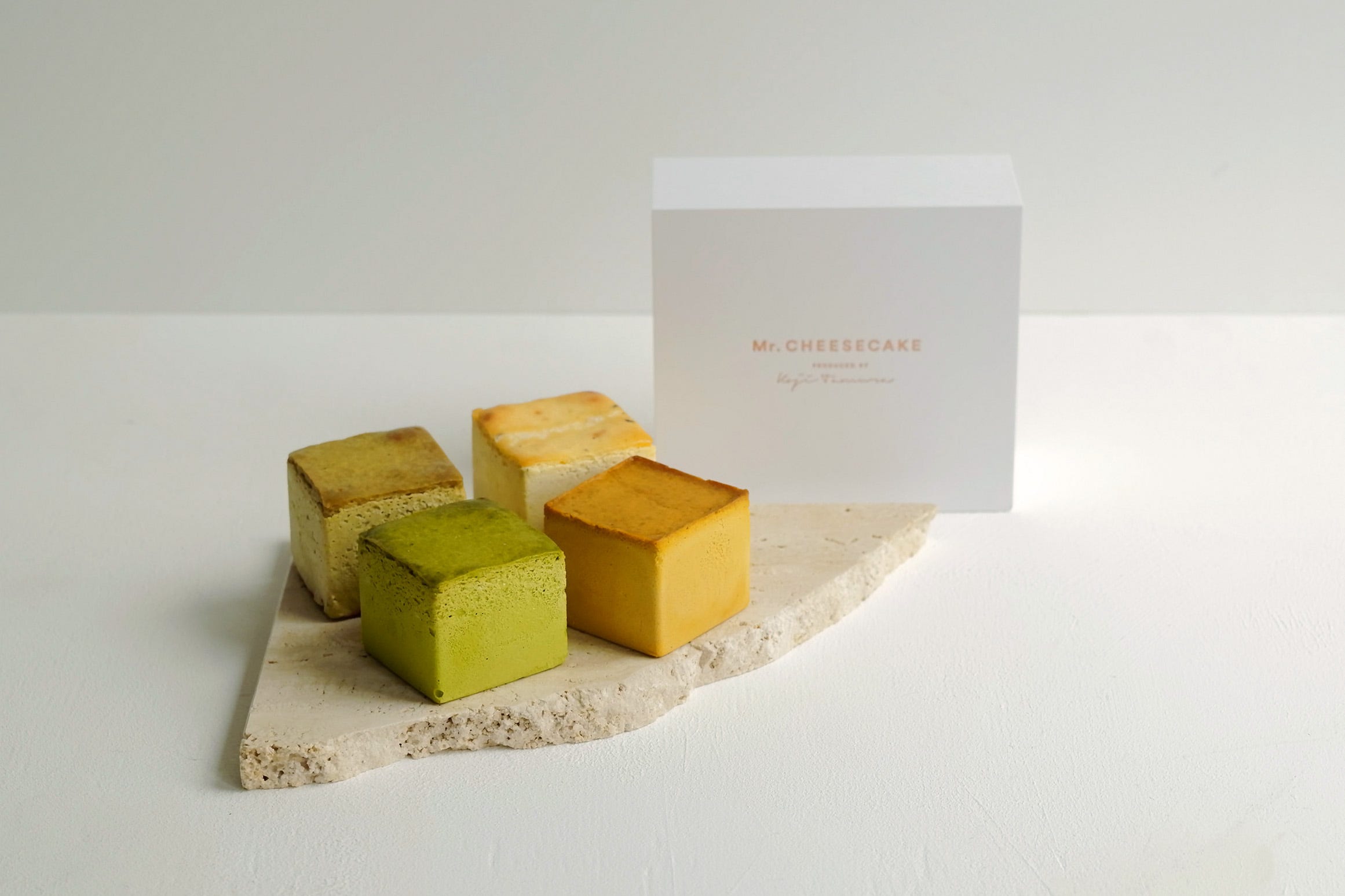 「Mr. CHEESECAKE assorted 4-Cube Box YOUR BEST」5,616円 2023年4月に実施された「Mr. CHEESECAKE」の“フレーバー総選挙”で、20種の限定フレーバーから、上位にランクインした4つを詰め合わせたアソートセットが店頭に初登場。食べ比べや大切な人とのシェアにぴったりなキューブ型のチーズケーキです。
